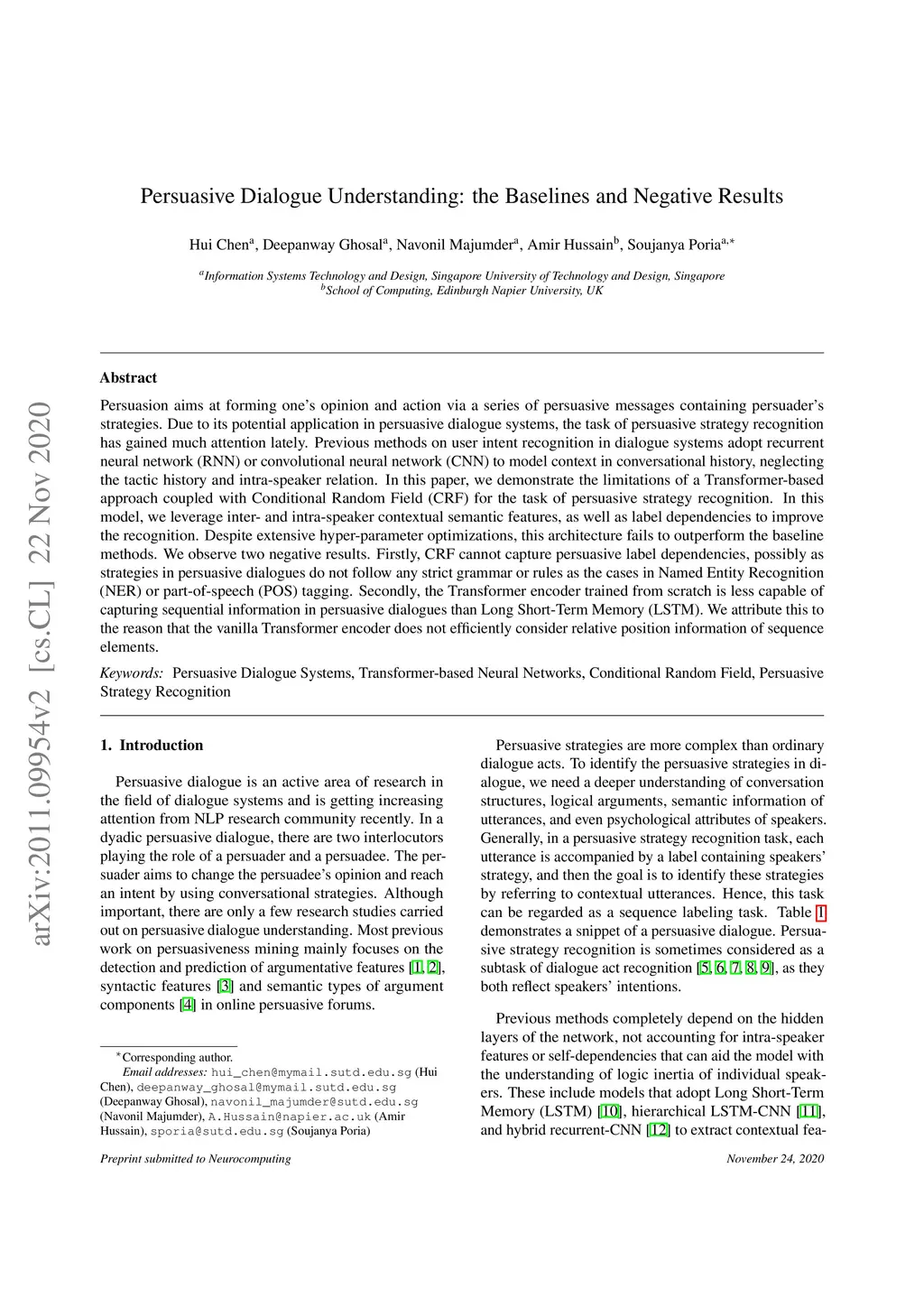 Persuasion aims at forming one's opinion and action via a series of persuasive messages containing persuader's strategies. Due to its potential application in persuasive dialogue systems, the task of persuasive strategy recognition has gained much attention lately. Previous methods on user intent recognition in dialogue systems adopt recurrent neural network (RNN) or convolutional neural network (CNN) to model context in conversational history, neglecting the tactic history and intra-speaker relation. In this paper, we demonstrate the limitations of a Transformer-based approach coupled with Conditional Random Field (CRF) for the task of persuasive strategy recognition. In this model, we leverage inter- and intra-speaker contextual semantic features, as well as label dependencies to improve the recognition. Despite extensive hyper-parameter optimizations, this architecture fails to outperform the baseline methods. We observe two negative results. Firstly, CRF cannot capture persuasive label dependencies, possibly as strategies in persuasive dialogues do not follow any strict grammar or rules as the cases in Named Entity Recognition (NER) or part-of-speech (POS) tagging. Secondly, the Transformer encoder trained from scratch is less capable of capturing sequential information in persuasive dialogues than Long Short-Term Memory (LSTM). We attribute this to the reason that the vanilla Transformer encoder does not efficiently consider relative position information of sequence elements.