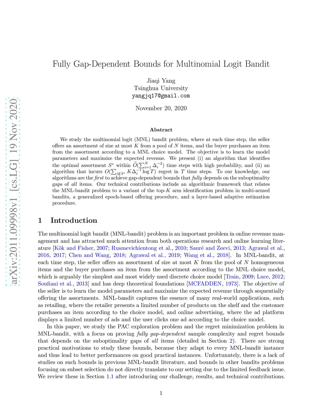 We study the multinomial logit (MNL) bandit problem, where at each time step, the seller offers an assortment of size at most from a pool of items, and the buyer purchases an item from the assortment according to a MNL choice model. The objective is to learn the model parameters and maximize the expected revenue. We present (i) an algorithm that identifies the optimal assortment within time steps with high probability, and (ii) an algorithm that incurs regret in time steps. To our knowledge, our algorithms are the first to achieve gap-dependent bounds that fully depends on the suboptimality gaps of all items. Our technical contributions include an algorithmic framework that relates the MNL-bandit problem to a variant of the top- arm identification problem in multi-armed bandits, a generalized epoch-based offering procedure, and a layer-based adaptive estimation procedure.