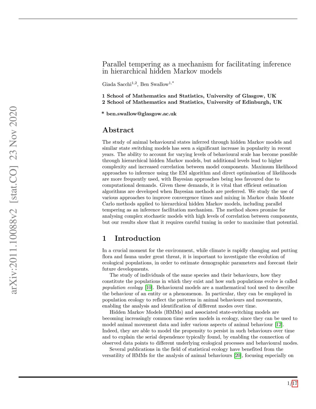 The study of animal behavioural states inferred through hidden Markov models and similar state switching models has seen a significant increase in popularity in recent years. The ability to account for varying levels of behavioural scale has become possible through hierarchical hidden Markov models, but additional levels lead to higher complexity and increased correlation between model components. Maximum likelihood approaches to inference using the EM algorithm and direct optimisation of likelihoods are more frequently used, with Bayesian approaches being less favoured due to computational demands. Given these demands, it is vital that efficient estimation algorithms are developed when Bayesian methods are preferred. We study the use of various approaches to improve convergence times and mixing in Markov chain Monte Carlo methods applied to hierarchical hidden Markov models, including parallel tempering as an inference facilitation mechanism. The method shows promise for analysing complex stochastic models with high levels of correlation between components, but our results show that it requires careful tuning in order to maximise that potential.