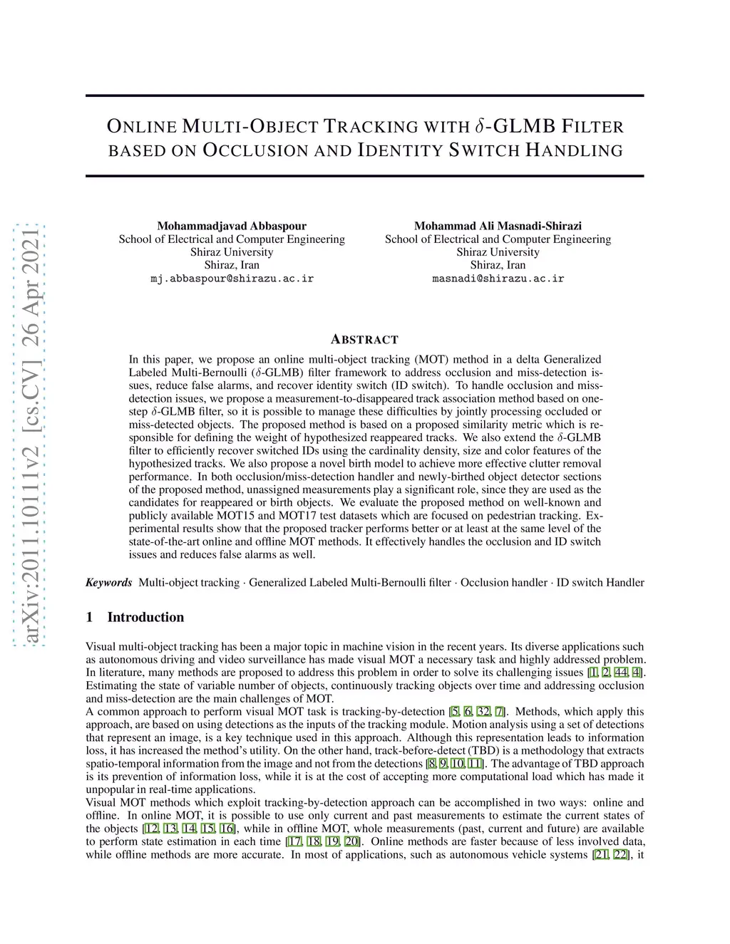 In this paper, we propose an online multi-object tracking (MOT) method in a delta Generalized Labeled Multi-Bernoulli (delta-GLMB) filter framework to address occlusion and miss-detection issues, reduce false alarms, and recover identity switch (ID switch). To handle occlusion and miss-detection issues, we propose a measurement-to-disappeared track association method based on one-step delta-GLMB filter, so it is possible to manage these difficulties by jointly processing occluded or miss-detected objects. This part of proposed method is based on a proposed similarity metric which is responsible for defining the weight of hypothesized reappeared tracks. We also extend the delta-GLMB filter to efficiently recover switched IDs using the cardinality density, size and color features of the hypothesized tracks. We also propose a novel birth model to achieve more effective clutter removal performance. In both occlusion/miss-detection handler and newly-birthed object detector sections of the proposed method, unassigned measurements play a significant role, since they are used as the candidates for reappeared or birth objects. In addition, we perform an ablation study which confirms the effectiveness of our contributions in comparison with the baseline method. We evaluate the proposed method on well-known and publicly available MOT15 and MOT17 test datasets which are focused on pedestrian tracking. Experimental results show that the proposed tracker performs better or at least at the same level of the state-of-the-art online and offline MOT methods. It effectively handles the occlusion and ID switch issues and reduces false alarms as well.