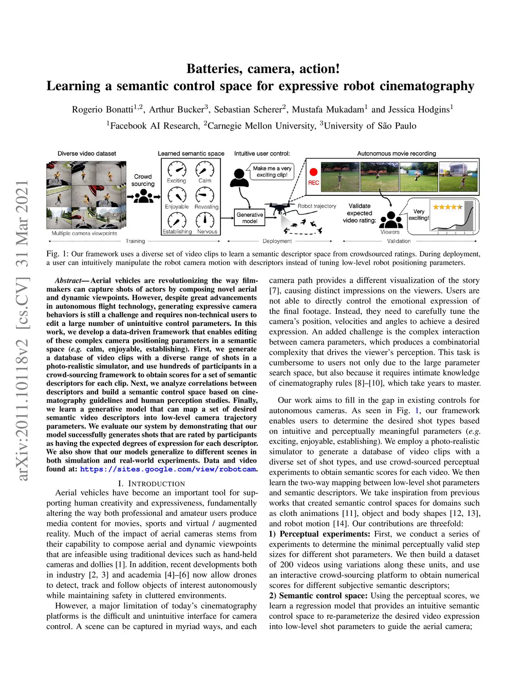 Aerial vehicles are revolutionizing the way film-makers can capture shots of actors by composing novel aerial and dynamic viewpoints. However, despite great advancements in autonomous flight technology, generating expressive camera behaviors is still a challenge and requires non-technical users to edit a large number of unintuitive control parameters. In this work, we develop a data-driven framework that enables editing of these complex camera positioning parameters in a semantic space (e.g. calm, enjoyable, establishing). First, we generate a database of video clips with a diverse range of shots in a photo-realistic simulator, and use hundreds of participants in a crowd-sourcing framework to obtain scores for a set of semantic descriptors for each clip. Next, we analyze correlations between descriptors and build a semantic control space based on cinematography guidelines and human perception studies. Finally, we learn a generative model that can map a set of desired semantic video descriptors into low-level camera trajectory parameters. We evaluate our system by demonstrating that our model successfully generates shots that are rated by participants as having the expected degrees of expression for each descriptor. We also show that our models generalize to different scenes in both simulation and real-world experiments. Data and video found at: https://sites.google.com/view/robotcam.