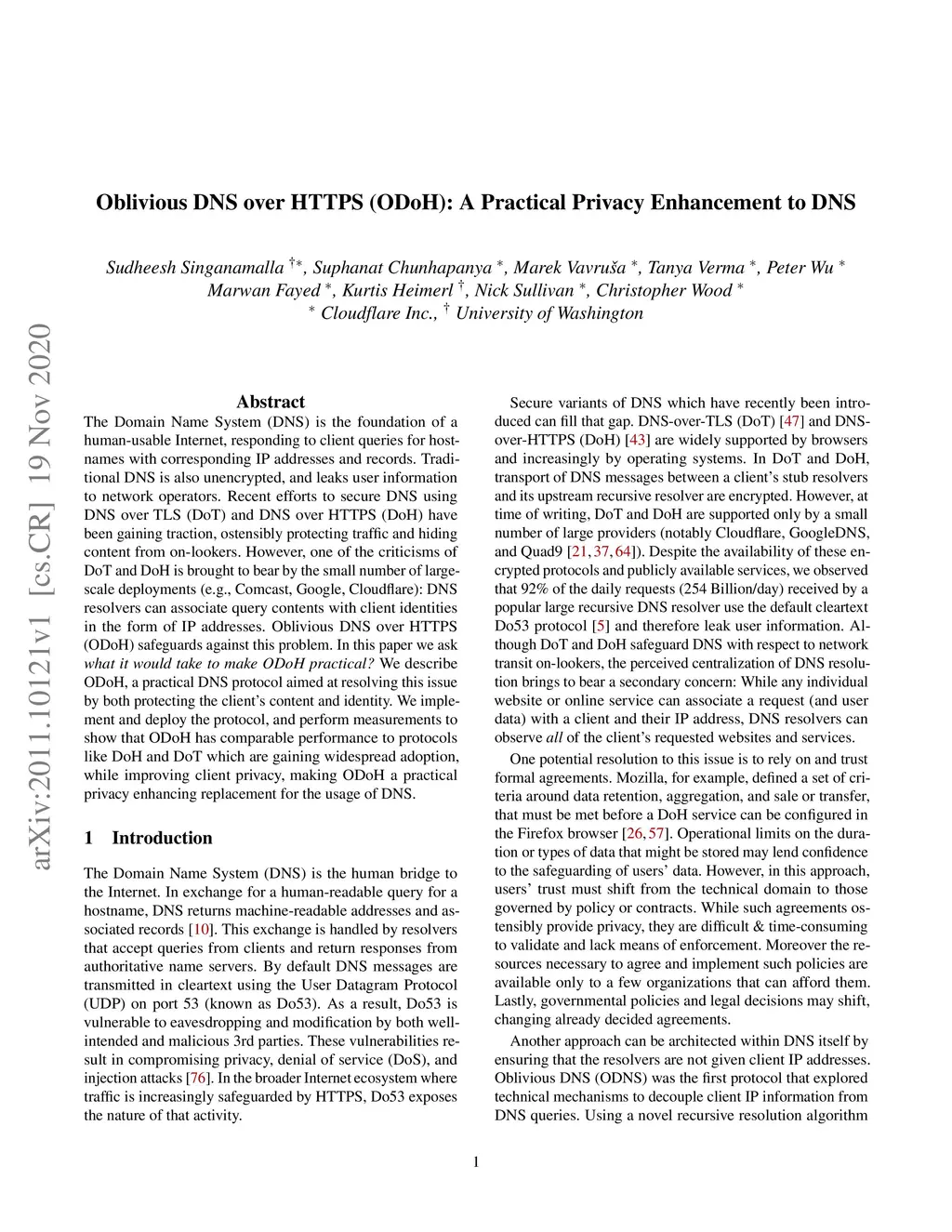 Oblivious DNS over HTTPS (ODoH): A Practical Privacy Enhancement to DNS