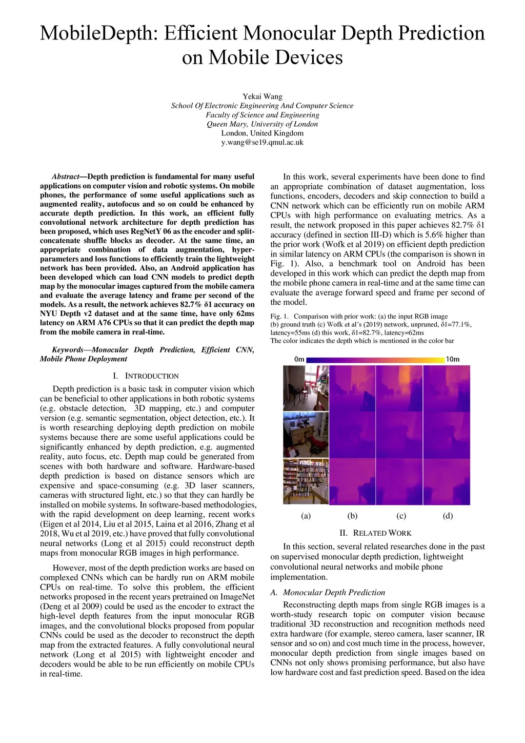 Depth prediction is fundamental for many useful applications on computer vision and robotic systems. On mobile phones, the performance of some useful applications such as augmented reality, autofocus and so on could be enhanced by accurate depth prediction. In this work, an efficient fully convolutional network architecture for depth prediction has been proposed, which uses RegNetY 06 as the encoder and split-concatenate shuffle blocks as decoder. At the same time, an appropriate combination of data augmentation, hyper-parameters and loss functions to efficiently train the lightweight network has been provided. Also, an Android application has been developed which can load CNN models to predict depth map by the monocular images captured from the mobile camera and evaluate the average latency and frame per second of the models. As a result, the network achieves 82.7% {\delta}1 accuracy on NYU Depth v2 dataset and at the same time, have only 62ms latency on ARM A76 CPUs so that it can predict the depth map from the mobile camera in real-time.