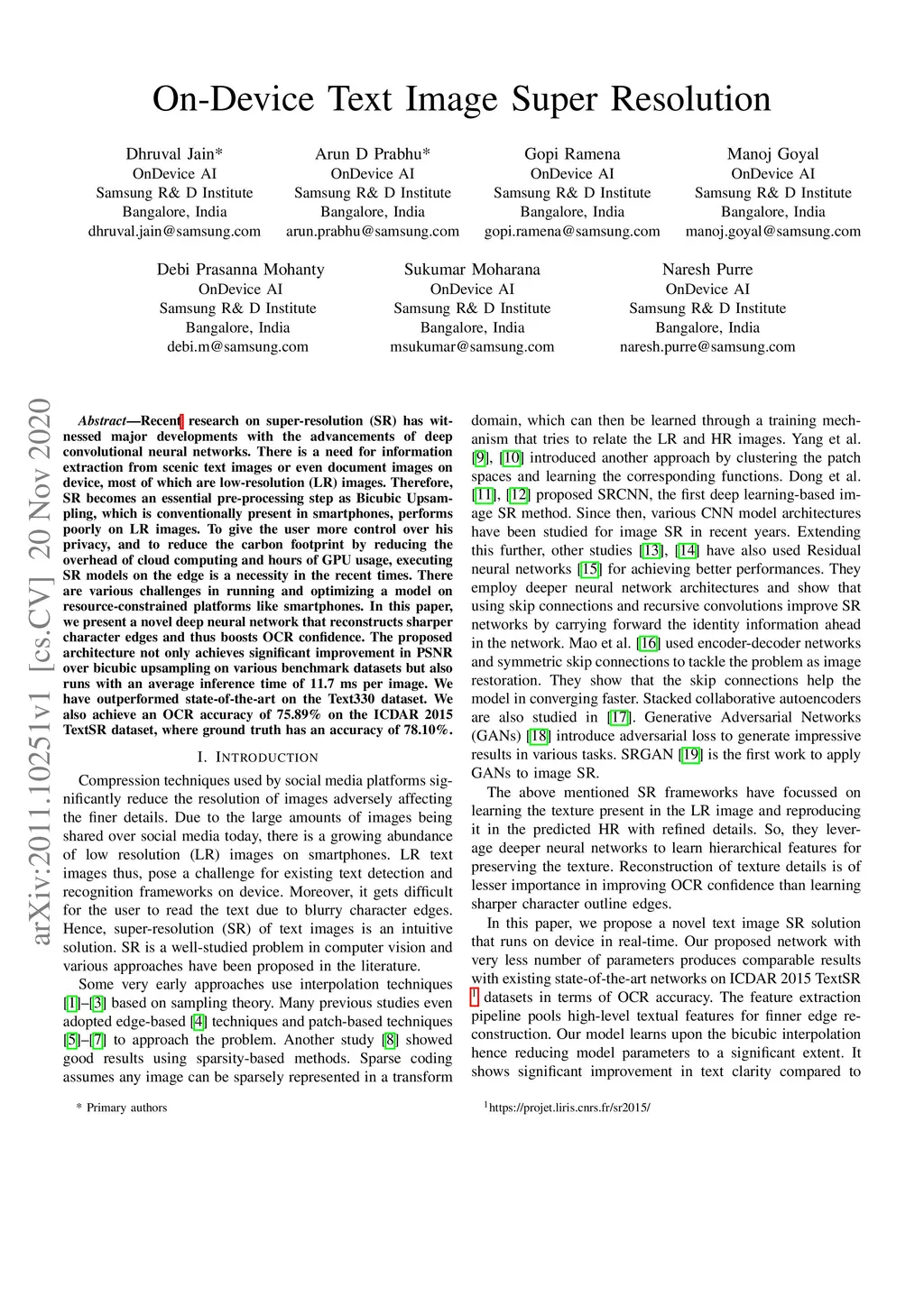 Recent research on super-resolution (SR) has witnessed major developments with the advancements of deep convolutional neural networks. There is a need for information extraction from scenic text images or even document images on device, most of which are low-resolution (LR) images. Therefore, SR becomes an essential pre-processing step as Bicubic Upsampling, which is conventionally present in smartphones, performs poorly on LR images. To give the user more control over his privacy, and to reduce the carbon footprint by reducing the overhead of cloud computing and hours of GPU usage, executing SR models on the edge is a necessity in the recent times. There are various challenges in running and optimizing a model on resource-constrained platforms like smartphones. In this paper, we present a novel deep neural network that reconstructs sharper character edges and thus boosts OCR confidence. The proposed architecture not only achieves significant improvement in PSNR over bicubic upsampling on various benchmark datasets but also runs with an average inference time of 11.7 ms per image. We have outperformed state-of-the-art on the Text330 dataset. We also achieve an OCR accuracy of 75.89% on the ICDAR 2015 TextSR dataset, where ground truth has an accuracy of 78.10%.