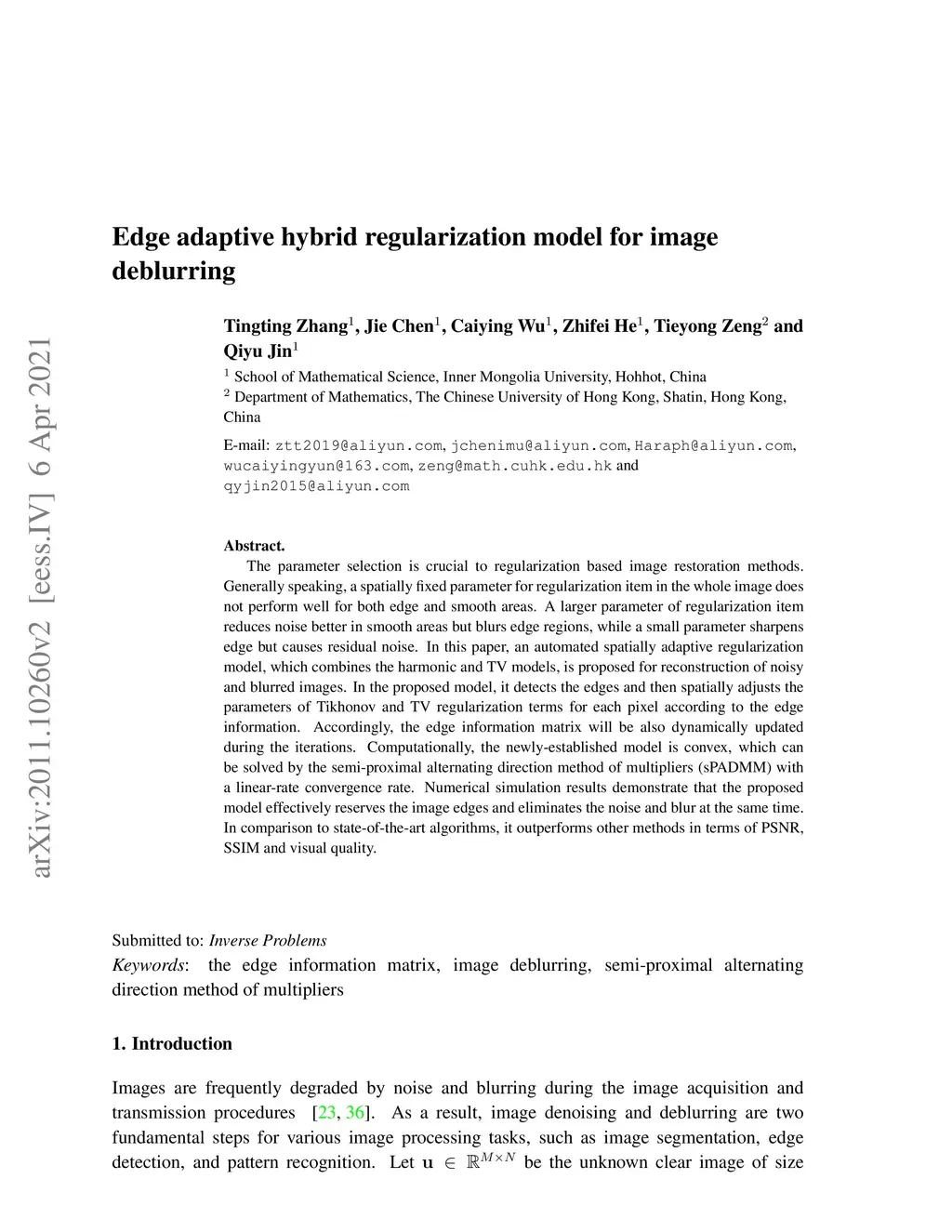 The parameter selection is crucial to regularization based image restoration methods. Generally speaking, a spatially fixed parameter for regularization item in the whole image does not perform well for both edge and smooth areas. A larger parameter of regularization item reduces noise better in smooth areas but blurs edge regions, while a small parameter sharpens edge but causes residual noise. In this paper, an automated spatially adaptive regularization model, which combines the harmonic and TV models, is proposed for reconstruction of noisy and blurred images. In the proposed model, it detects the edges and then spatially adjusts the parameters of Tikhonov and TV regularization terms for each pixel according to the edge information. Accordingly, the edge information matrix will be also dynamically updated during the iterations. Computationally, the newly-established model is convex, which can be solved by the semi-proximal alternating direction method of multipliers (sPADMM) with a linear-rate convergence rate. Numerical simulation results demonstrate that the proposed model effectively reserves the image edges and eliminates the noise and blur at the same time. In comparison to state-of-the-art algorithms, it outperforms other methods in terms of PSNR, SSIM and visual quality.