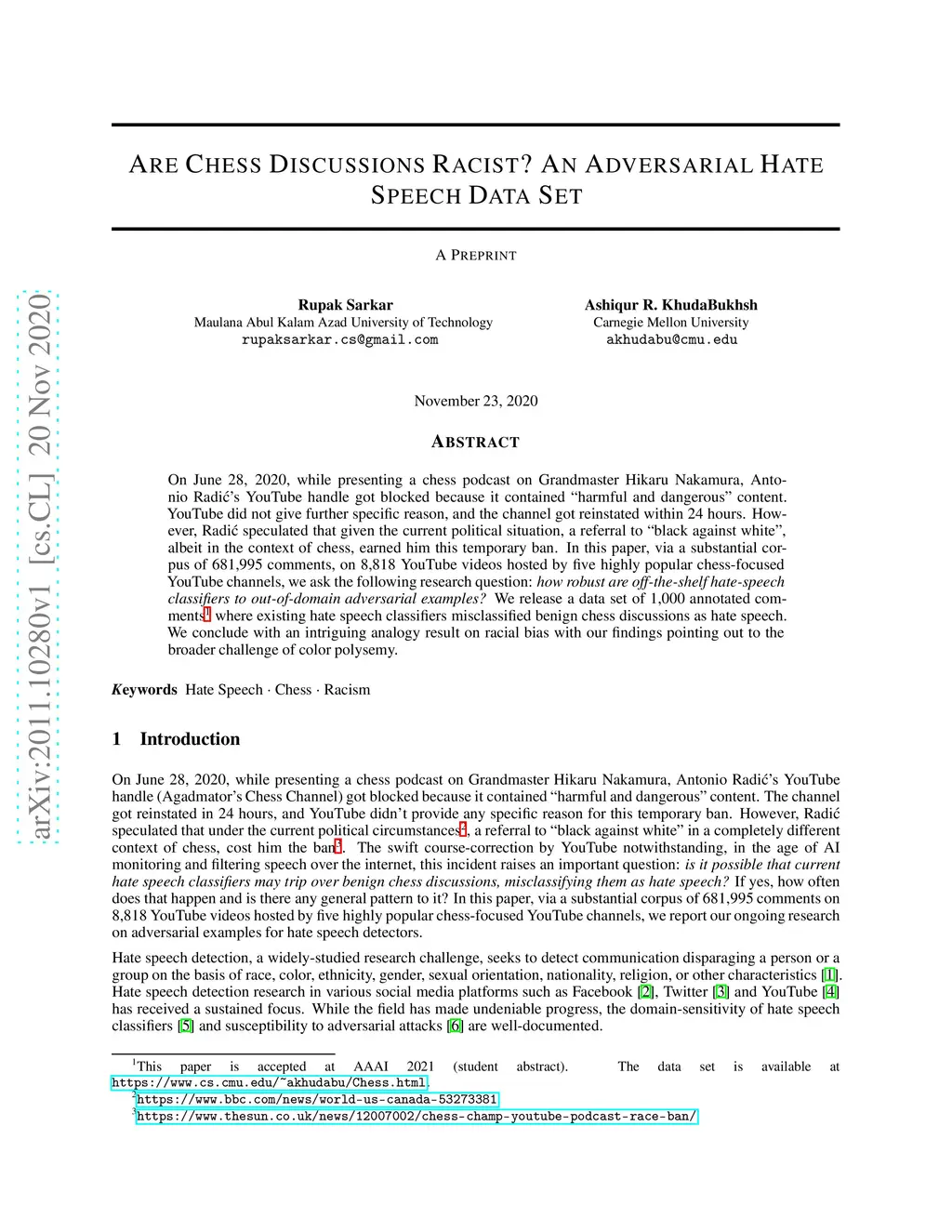 Are Chess Discussions Racist? An Adversarial Hate Speech Data Set