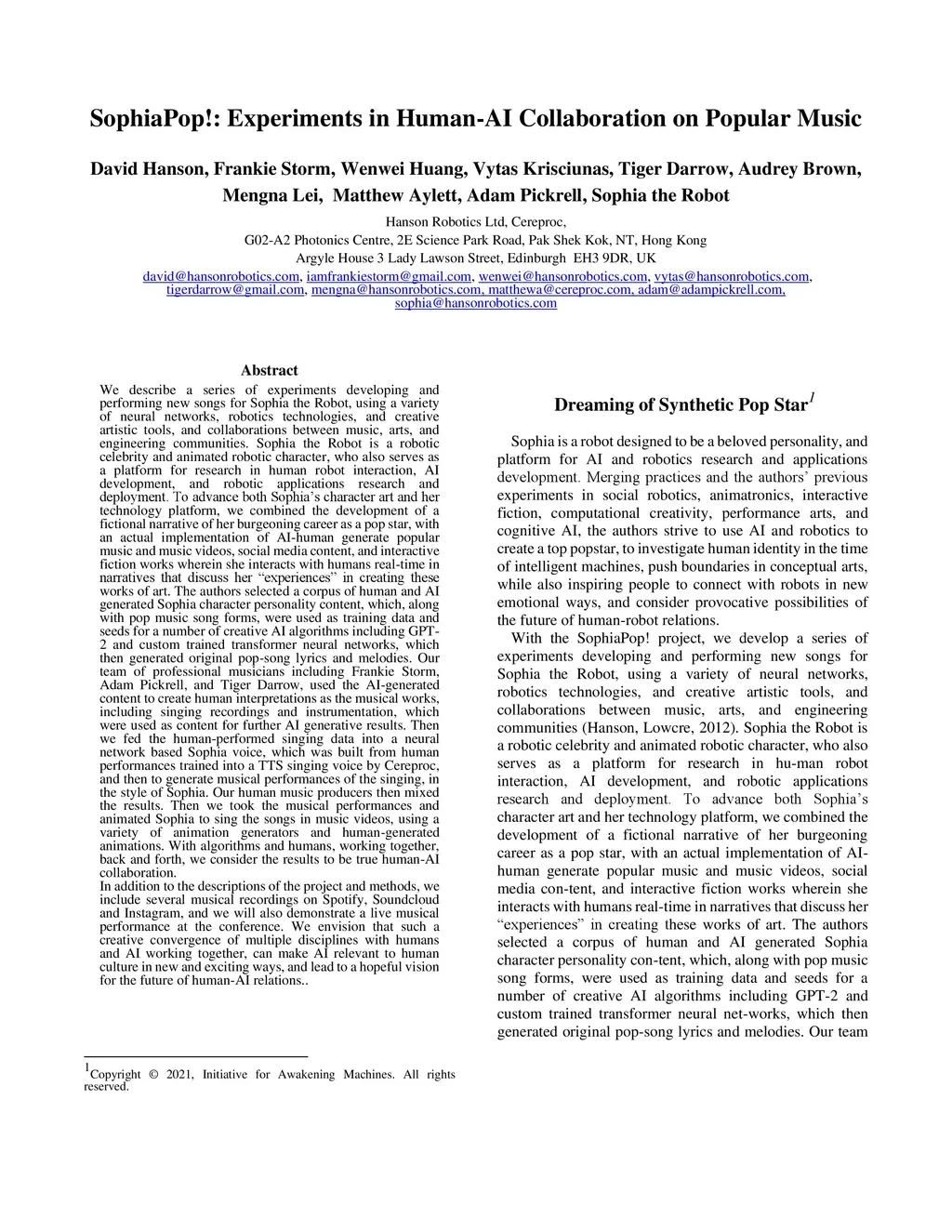 A diverse team of engineers, artists, and algorithms, collaborated to create songs for SophiaPop, via various neural networks, robotics technologies, and artistic tools, and animated the results on Sophia the Robot, a robotic celebrity and animated character. Sophia is a platform for arts, research, and other uses. To advance the art and technology of Sophia, we combine various AI with a fictional narrative of her burgeoning career as a popstar. Her actual AI-generated pop lyrics, music, and paintings, and animated conversations wherein she interacts with humans real-time in narratives that discuss her experiences. To compose the music, SophiaPop team built corpora from human and AI-generated Sophia character personality content, along with pop music song forms, to train and provide seeds for a number of AI algorithms including expert models, and custom-trained transformer neural networks, which then generated original pop-song lyrics and melodies. Our musicians including Frankie Storm, Adam Pickrell, and Tiger Darrow, then performed interpretations of the AI-generated musical content, including singing and instrumentation. The human-performed singing data then was processed by a neural-network-based Sophia voice, which was custom-trained from human performances by Cereproc. This AI then generated the unique Sophia voice singing of the songs. Then we animated Sophia to sing the songs in music videos, using a variety of animation generators and human-generated animations. Being algorithms and humans, working together, SophiaPop represents a human-AI collaboration, aspiring toward human AI symbiosis. We believe that such a creative convergence of multiple disciplines with humans and AI working together, can make AI relevant to human culture in new and exciting ways, and lead to a hopeful vision for the future of human-AI relations.