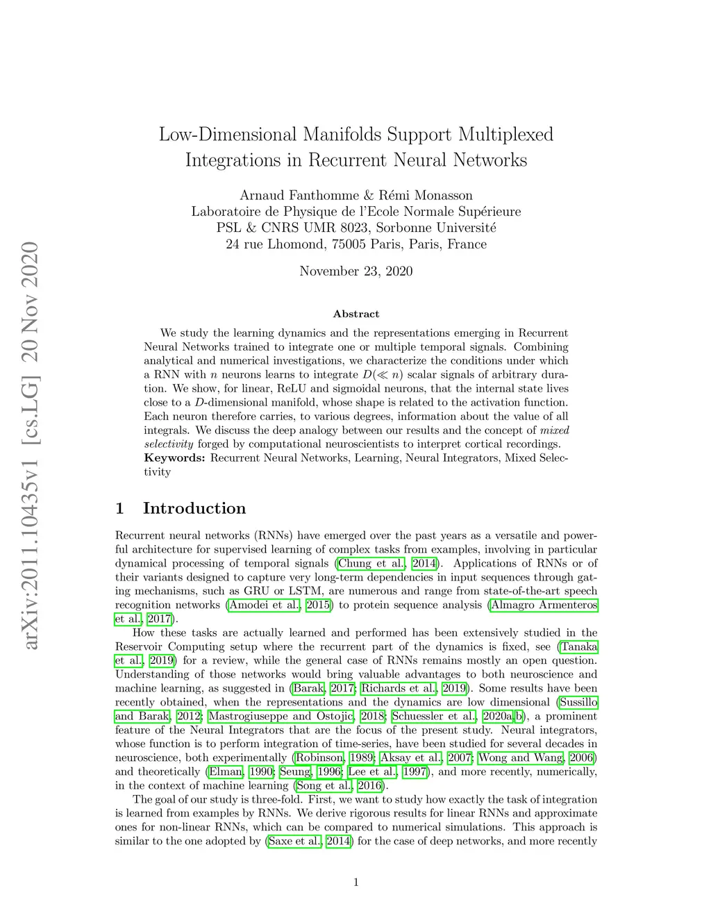 We study the learning dynamics and the representations emerging in Recurrent Neural Networks trained to integrate one or multiple temporal signals. Combining analytical and numerical investigations, we characterize the conditions under which a RNN with n neurons learns to integrate D(n) scalar signals of arbitrary duration. We show, both for linear and ReLU neurons, that its internal state lives close to a D-dimensional manifold, whose shape is related to the activation function. Each neuron therefore carries, to various degrees, information about the value of all integrals. We discuss the deep analogy between our results and the concept of mixed selectivity forged by computational neuroscientists to interpret cortical recordings.