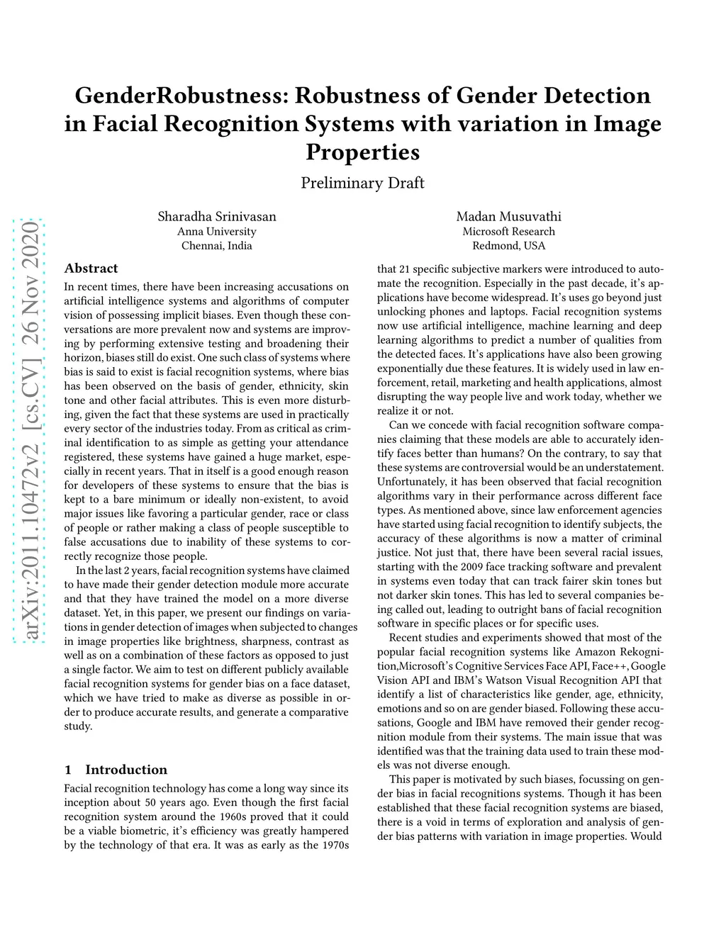 In recent times, there have been increasing accusations on artificial intelligence systems and algorithms of computer vision of possessing implicit biases. Even though these conversations are more prevalent now and systems are improving by performing extensive testing and broadening their horizon, biases still do exist. One such class of systems where bias is said to exist is facial recognition systems, where bias has been observed on the basis of gender, ethnicity, skin tone and other facial attributes. This is even more disturbing, given the fact that these systems are used in practically every sector of the industries today. From as critical as criminal identification to as simple as getting your attendance registered, these systems have gained a huge market, especially in recent years. That in itself is a good enough reason for developers of these systems to ensure that the bias is kept to a bare minimum or ideally non-existent, to avoid major issues like favoring a particular gender, race, or class of people or rather making a class of people susceptible to false accusations due to inability of these systems to correctly recognize those people.