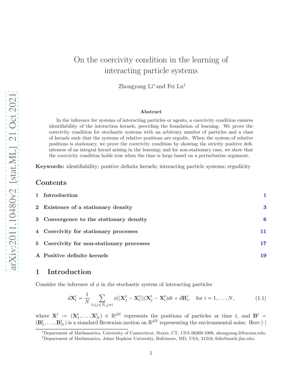 In the learning of systems of interacting particles or agents, coercivity condition ensures identifiability of the interaction functions, providing the foundation of learning by nonparametric regression. The coercivity condition is equivalent to the strictly positive definiteness of an integral kernel arising in the learning. We show that for a class of interaction functions such that the system is ergodic, the integral kernel is strictly positive definite, and hence the coercivity condition holds true.