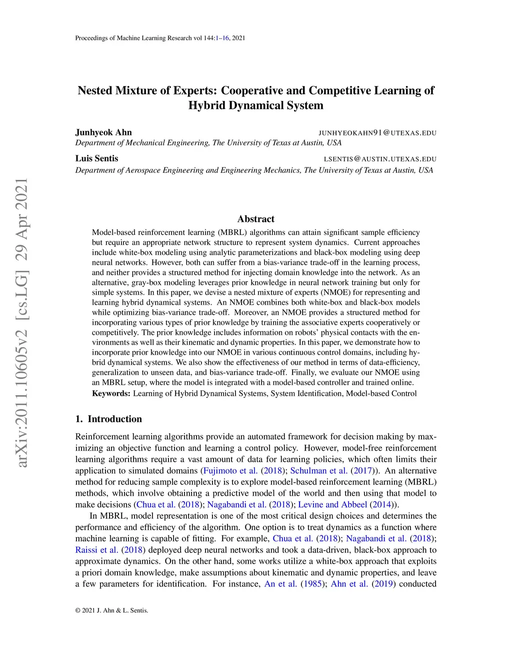 Model-based reinforcement learning (MBRL) algorithms can attain significant sample efficiency but require an appropriate network structure to represent system dynamics. Current approaches include white-box modeling using analytic parameterizations and black-box modeling using deep neural networks. However, both can suffer from a bias-variance trade-off in the learning process, and neither provides a structured method for injecting domain knowledge into the network. As an alternative, gray-box modeling leverages prior knowledge in neural network training but only for simple systems. In this paper, we devise a nested mixture of experts (NMOE) for representing and learning hybrid dynamical systems. An NMOE combines both white-box and black-box models while optimizing bias-variance trade-off. Moreover, an NMOE provides a structured method for incorporating various types of prior knowledge by training the associative experts cooperatively or competitively. The prior knowledge includes information on robots' physical contacts with the environments as well as their kinematic and dynamic properties. In this paper, we demonstrate how to incorporate prior knowledge into our NMOE in various continuous control domains, including hybrid dynamical systems. We also show the effectiveness of our method in terms of data-efficiency, generalization to unseen data, and bias-variance trade-off. Finally, we evaluate our NMOE using an MBRL setup, where the model is integrated with a model-based controller and trained online.