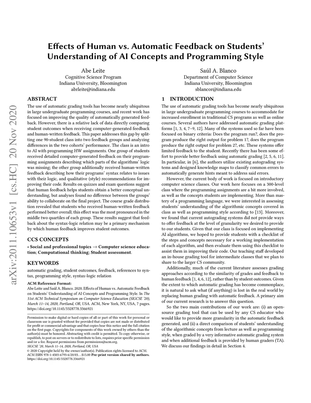 The use of automatic grading tools has become nearly ubiquitous in large undergraduate programming courses, and recent work has focused on improving the quality of automatically generated feedback. However, there is a relative lack of data directly comparing student outcomes when receiving computer-generated feedback and human-written feedback. This paper addresses this gap by splitting one 90-student class into two feedback groups and analyzing differences in the two cohorts' performance. The class is an intro to AI with programming HW assignments. One group of students received detailed computer-generated feedback on their programming assignments describing which parts of the algorithms' logic was missing; the other group additionally received human-written feedback describing how their programs' syntax relates to issues with their logic, and qualitative (style) recommendations for improving their code. Results on quizzes and exam questions suggest that human feedback helps students obtain a better conceptual understanding, but analyses found no difference between the groups' ability to collaborate on the final project. The course grade distribution revealed that students who received human-written feedback performed better overall; this effect was the most pronounced in the middle two quartiles of each group. These results suggest that feedback about the syntax-logic relation may be a primary mechanism by which human feedback improves student outcomes.