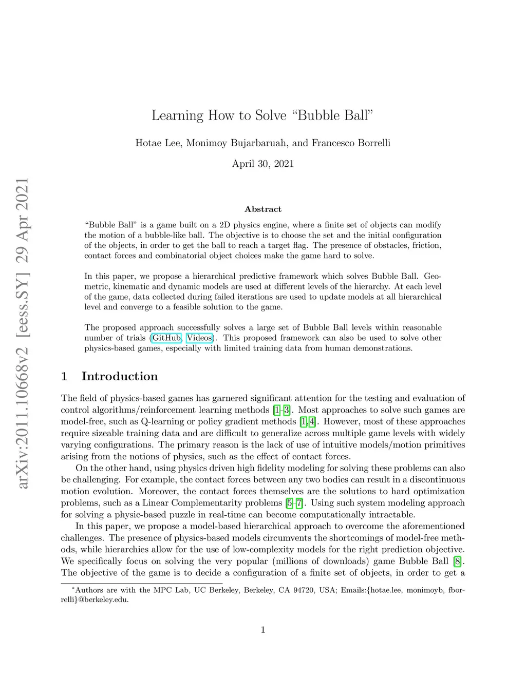 "Bubble Ball" is a game built on a 2D physics engine, where a finite set of objects can modify the motion of a bubble-like ball. The objective is to choose the set and the initial configuration of the objects, in order to get the ball to reach a target flag. The presence of obstacles, friction, contact forces and combinatorial object choices make the game hard to solve. In this paper, we propose a hierarchical predictive framework which solves Bubble Ball. Geometric, kinematic and dynamic models are used at different levels of the hierarchy. At each level of the game, data collected during failed iterations are used to update models at all hierarchical level and converge to a feasible solution to the game. The proposed approach successfully solves a large set of Bubble Ball levels within reasonable number of trials. This proposed framework can also be used to solve other physics-based games, especially with limited training data from human demonstrations.