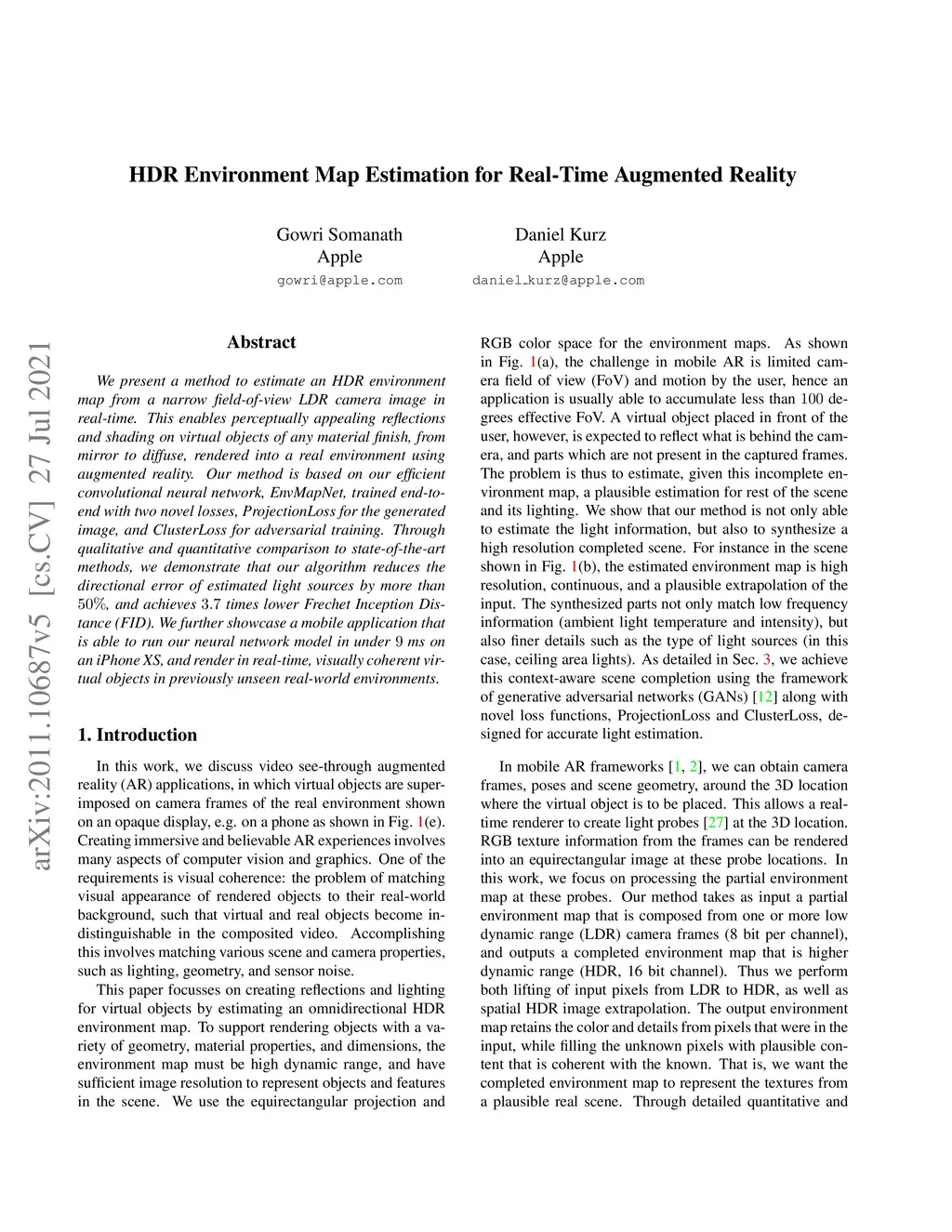 HDR Environment Map Estimation for Real-Time Augmented Reality