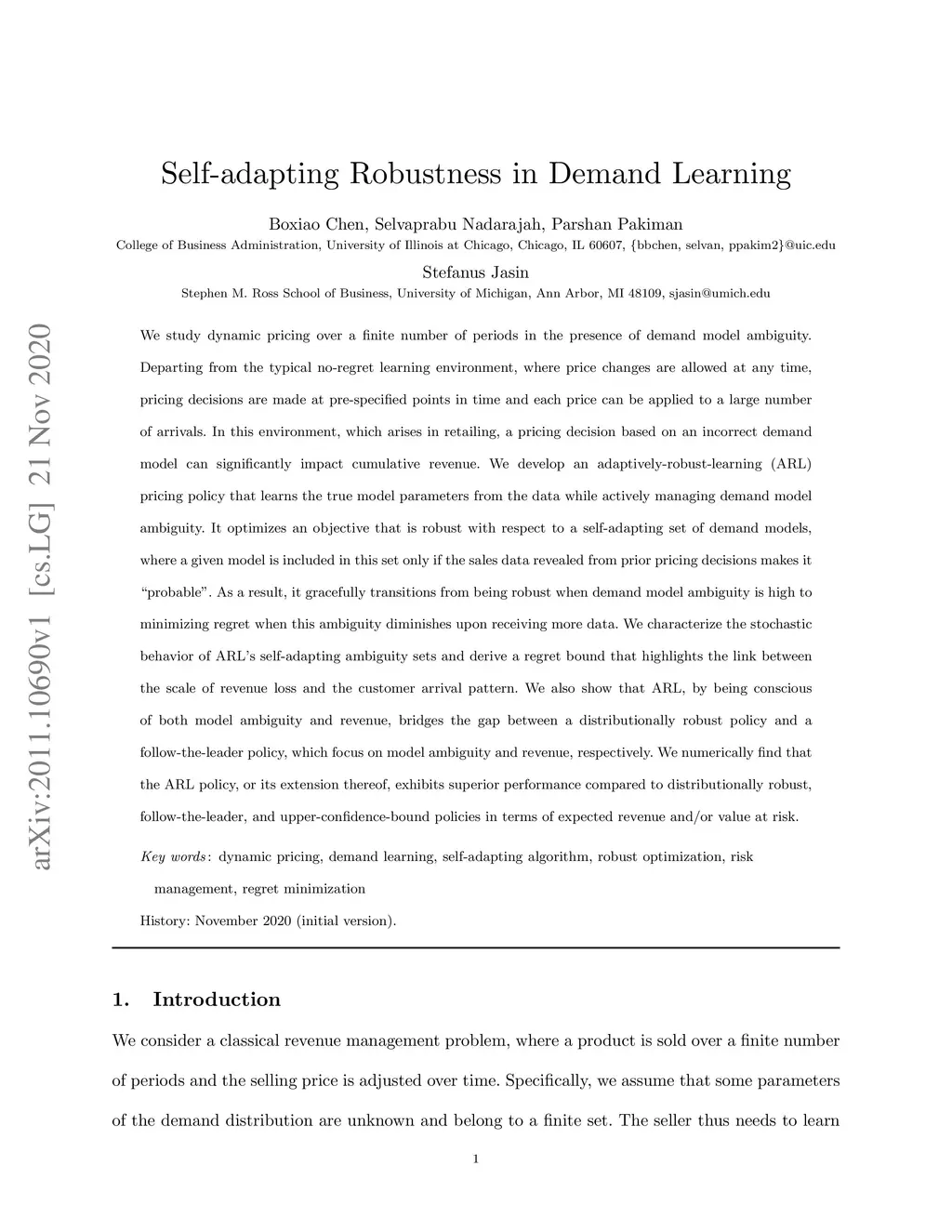 We study dynamic pricing of a product with an unknown demand distribution over a finite horizon. Departing from the standard no-regret learning environment in which prices can be adjusted at any time, we restrict price changes to predetermined points in time to reflect common retail practice. This constraint, coupled with demand model ambiguity and an unknown customer arrival pattern, imposes a high risk of revenue loss, as a price based on a misestimated demand model may be applied to many customers before it can be revised. We develop an adaptive risk learning (ARL) framework that embeds a data-driven ambiguity set (DAS) to quantify demand model ambiguity by adapting to the unknown arrival pattern. Initially, when arrivals are few, the DAS includes a broad set of plausible demand models, reflecting high ambiguity and revenue risk. As new data is collected through pricing, the DAS progressively shrinks, capturing the reduction in model ambiguity and associated risk. We establish the probabilistic convergence of the DAS to the true demand model and derive a regret bound for the ARL policy that explicitly links revenue loss to the data required for the DAS to identify the true model with high probability. The dependence of our regret bound on the arrival pattern is unique to our constrained dynamic pricing problem and contrasts with no-regret learning environments, where regret is constant and arrival-pattern independent. Relaxing the constraint on infrequent price changes, we show that ARL attains the known constant regret bound. Numerical experiments further demonstrate that ARL outperforms benchmarks that prioritize either regret or risk alone by adaptively balancing both without knowledge of the arrival pattern. This adaptive risk adjustment is crucial for achieving high revenues and low downside risk when prices are sticky and both demand and arrival patterns are unknown.