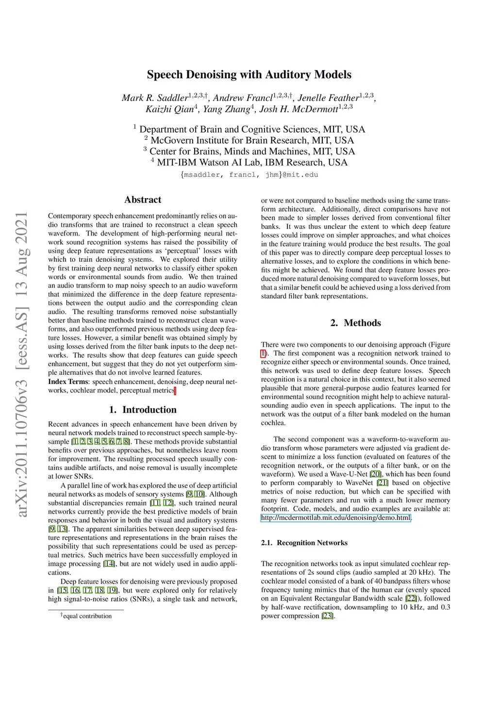 Contemporary speech enhancement predominantly relies on audio transforms that are trained to reconstruct a clean speech waveform. Here we investigate whether deep feature representations learned for audio classification tasks can be used to improve denoising. We first trained deep neural networks to classify either spoken words or environmental sounds from audio. We then trained an audio transform to map noisy speech to an audio waveform that minimized 'perceptual' losses derived from the recognition network. When the transform was trained to minimize the difference in the deep feature representations between the output audio and the corresponding clean audio, it removed noise substantially better than baseline methods trained to reconstruct clean waveforms. The learned deep features were essential for this improvement, as features from untrained networks with random weights did not provide the same benefit. The results suggest the use of deep features as perceptual metrics to guide speech enhancement.