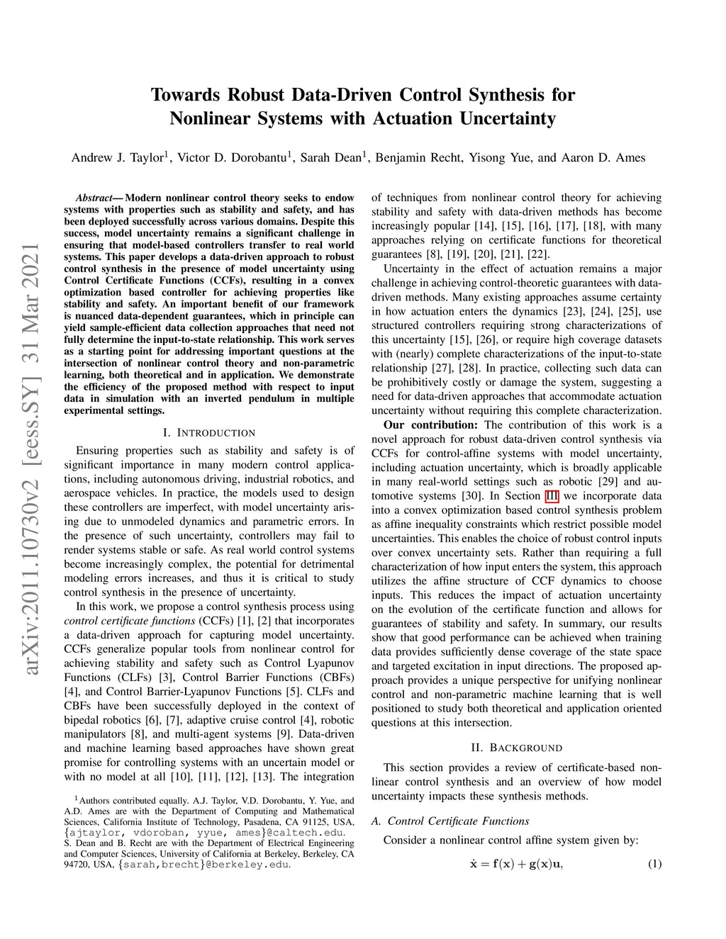 Modern nonlinear control theory seeks to endow systems with properties such as stability and safety, and has been deployed successfully across various domains. Despite this success, model uncertainty remains a significant challenge in ensuring that model-based controllers transfer to real world systems. This paper develops a data-driven approach to robust control synthesis in the presence of model uncertainty using Control Certificate Functions (CCFs), resulting in a convex optimization based controller for achieving properties like stability and safety. An important benefit of our framework is nuanced data-dependent guarantees, which in principle can yield sample-efficient data collection approaches that need not fully determine the input-to-state relationship. This work serves as a starting point for addressing important questions at the intersection of nonlinear control theory and non-parametric learning, both theoretical and in application. We validate the proposed method in simulation with an inverted pendulum in multiple experimental configurations.