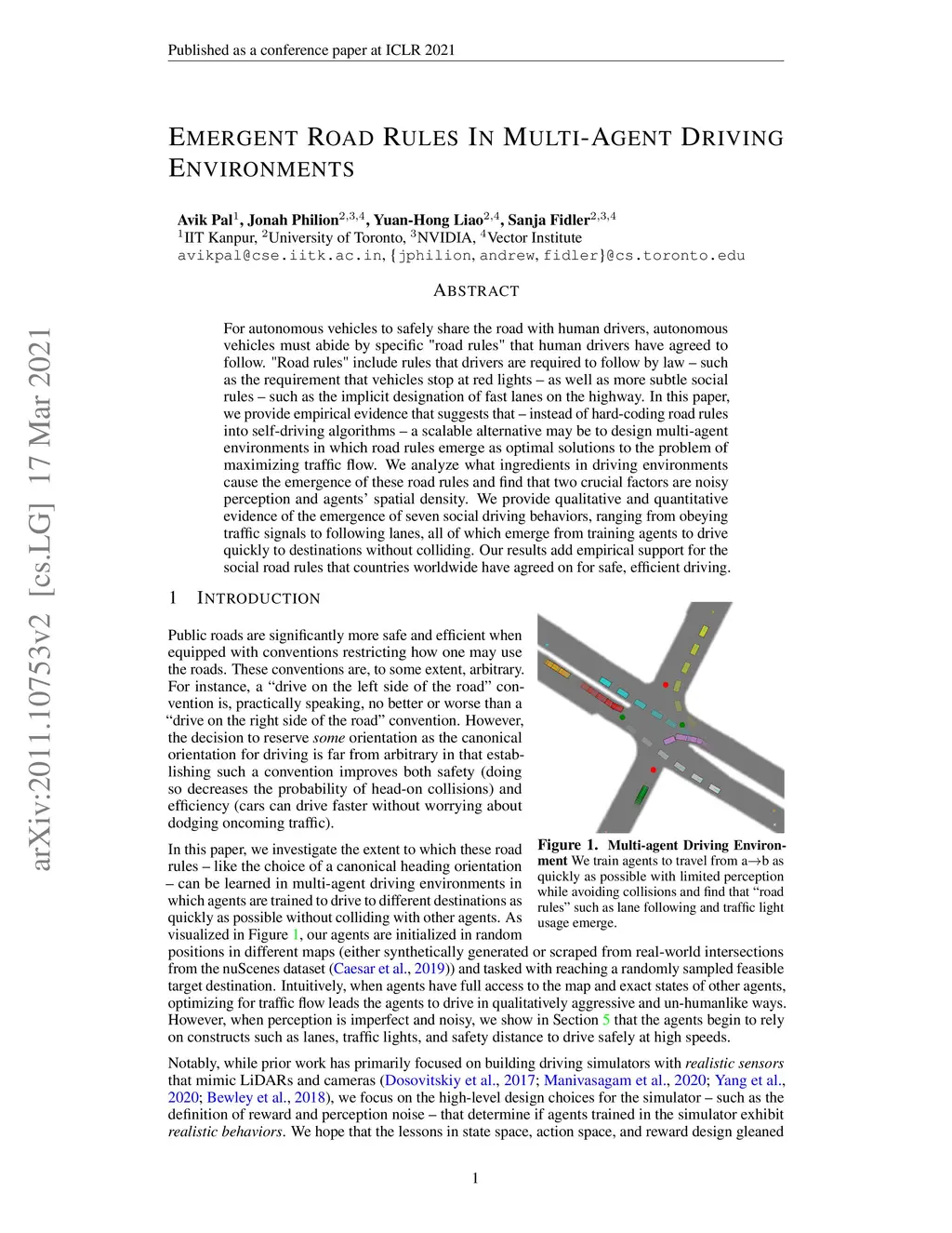 For autonomous vehicles to safely share the road with human drivers, autonomous vehicles must abide by specific "road rules" that human drivers have agreed to follow. "Road rules" include rules that drivers are required to follow by law -- such as the requirement that vehicles stop at red lights -- as well as more subtle social rules -- such as the implicit designation of fast lanes on the highway. In this paper, we provide empirical evidence that suggests that -- instead of hard-coding road rules into self-driving algorithms -- a scalable alternative may be to design multi-agent environments in which road rules emerge as optimal solutions to the problem of maximizing traffic flow. We analyze what ingredients in driving environments cause the emergence of these road rules and find that two crucial factors are noisy perception and agents' spatial density. We provide qualitative and quantitative evidence of the emergence of seven social driving behaviors, ranging from obeying traffic signals to following lanes, all of which emerge from training agents to drive quickly to destinations without colliding. Our results add empirical support for the social road rules that countries worldwide have agreed on for safe, efficient driving.