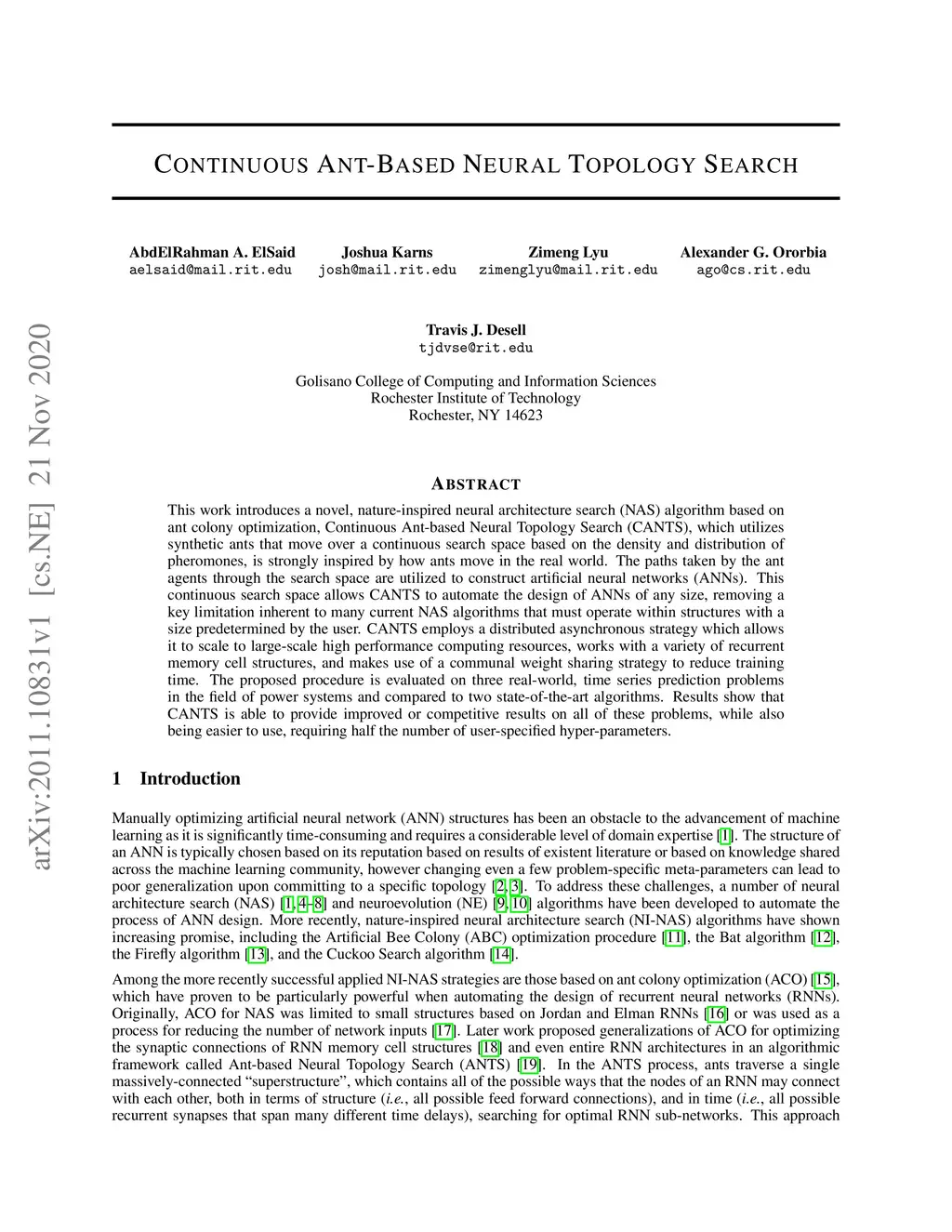 This work introduces a novel, nature-inspired neural architecture search (NAS) algorithm based on ant colony optimization, Continuous Ant-based Neural Topology Search (CANTS), which utilizes synthetic ants that move over a continuous search space based on the density and distribution of pheromones, is strongly inspired by how ants move in the real world. The paths taken by the ant agents through the search space are utilized to construct artificial neural networks (ANNs). This continuous search space allows CANTS to automate the design of ANNs of any size, removing a key limitation inherent to many current NAS algorithms that must operate within structures with a size predetermined by the user. CANTS employs a distributed asynchronous strategy which allows it to scale to large-scale high performance computing resources, works with a variety of recurrent memory cell structures, and makes use of a communal weight sharing strategy to reduce training time. The proposed procedure is evaluated on three real-world, time series prediction problems in the field of power systems and compared to two state-of-the-art algorithms. Results show that CANTS is able to provide improved or competitive results on all of these problems, while also being easier to use, requiring half the number of user-specified hyper-parameters.