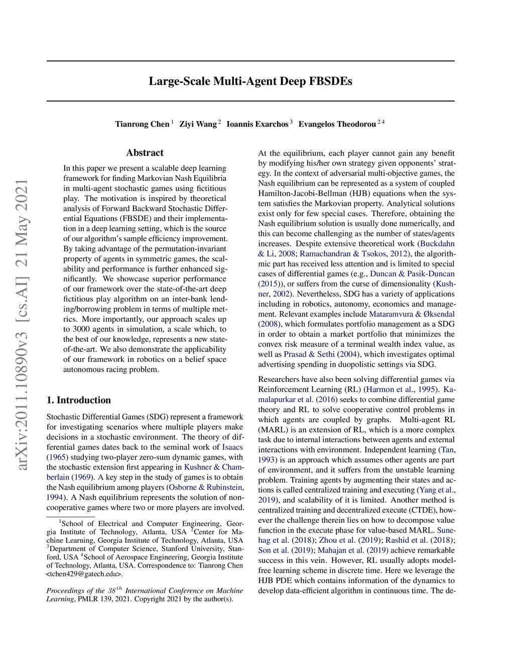 In this paper we present a scalable deep learning framework for finding Markovian Nash Equilibria in multi-agent stochastic games using fictitious play. The motivation is inspired by theoretical analysis of Forward Backward Stochastic Differential Equations (FBSDE) and their implementation in a deep learning setting, which is the source of our algorithm's sample efficiency improvement. By taking advantage of the permutation-invariant property of agents in symmetric games, the scalability and performance is further enhanced significantly. We showcase superior performance of our framework over the state-of-the-art deep fictitious play algorithm on an inter-bank lending/borrowing problem in terms of multiple metrics. More importantly, our approach scales up to 3000 agents in simulation, a scale which, to the best of our knowledge, represents a new state-of-the-art. We also demonstrate the applicability of our framework in robotics on a belief space autonomous racing problem.