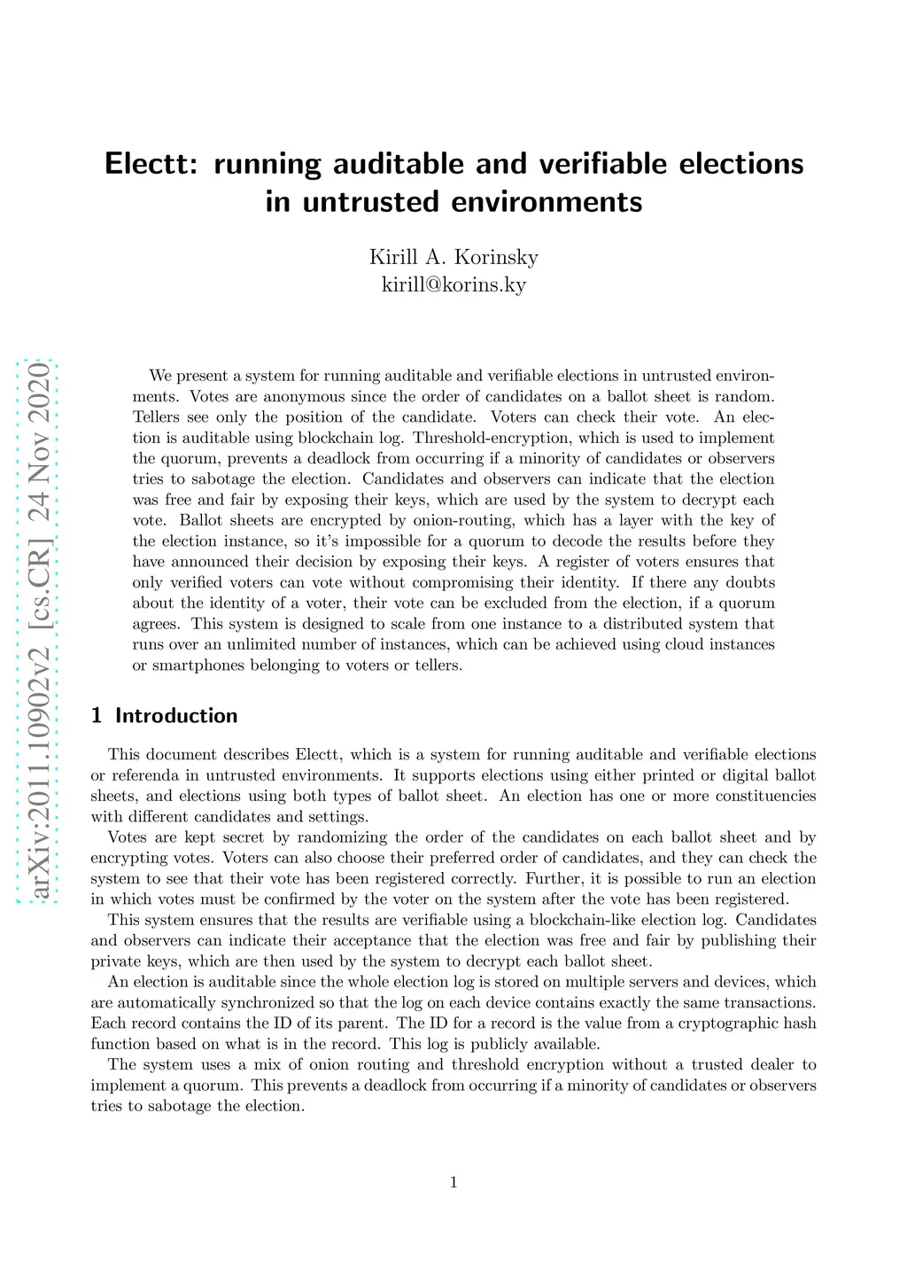 We present a system for running auditable and verifiable elections in untrusted environments. Votes are anonymous since the order of candidates on a ballot sheet is random. Tellers see only the position of the candidate. Voters can check their vote. An election is auditable using blockchain log. Threshold-encryption, which is used to implement the quorum, prevents a deadlock from occurring if a minority of candidates or observers tries to sabotage the election. Candidates and observers can indicate that the election was free and fair by exposing their keys, which are used by the system to decrypt each vote. Ballot sheets are encrypted by onion-routing, which has a layer with the key of the election instance, so it's impossible for a quorum to decode the results before they have announced their decision by exposing their keys. A register of voters ensures that only verified voters can vote without compromising their identity. If there any doubts about the identity of a voter, their vote can be excluded from the election, if a quorum agrees. This system is designed to scale from one instance to a distributed system that runs over an unlimited number of instances, which can be achieved using cloud instances or smartphones belonging to voters or tellers.