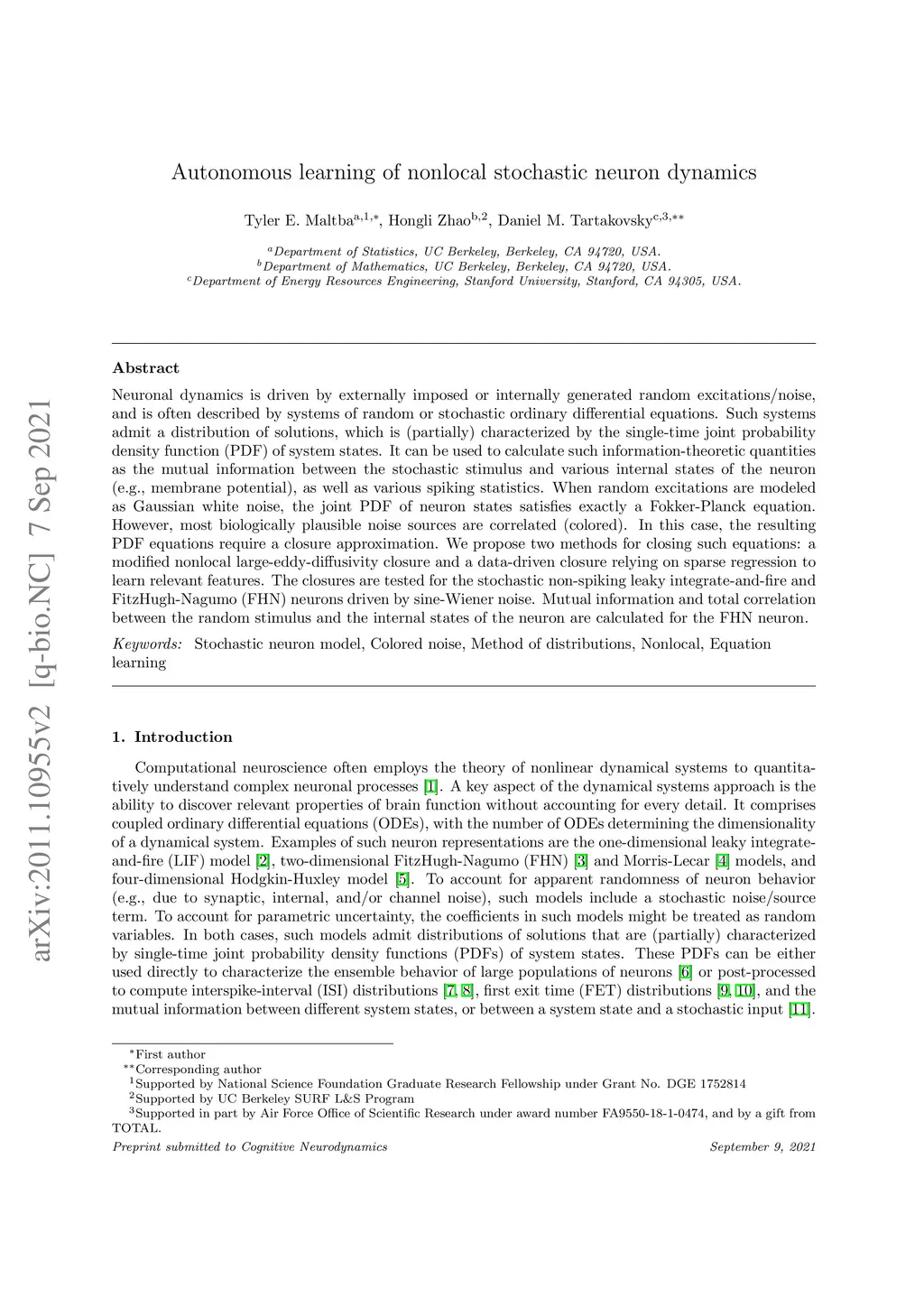 Neuronal dynamics is driven by externally imposed or internally generated random excitations/noise, and is often described by systems of random or stochastic ordinary differential equations. Such systems admit a distribution of solutions, which is (partially) characterized by the single-time joint probability density function (PDF) of system states. It can be used to calculate such information-theoretic quantities as the mutual information between the stochastic stimulus and various internal states of the neuron (e.g., membrane potential), as well as various spiking statistics. When random excitations are modeled as Gaussian white noise, the joint PDF of neuron states satisfies exactly a Fokker-Planck equation. However, most biologically plausible noise sources are correlated (colored). In this case, the resulting PDF equations require a closure approximation. We propose two methods for closing such equations: a modified nonlocal large-eddy-diffusivity closure and a data-driven closure relying on sparse regression to learn relevant features. The closures are tested for the stochastic non-spiking leaky integrate-and-fire and FitzHugh-Nagumo (FHN) neurons driven by sine-Wiener noise. Mutual information and total correlation between the random stimulus and the internal states of the neuron are calculated for the FHN neuron.