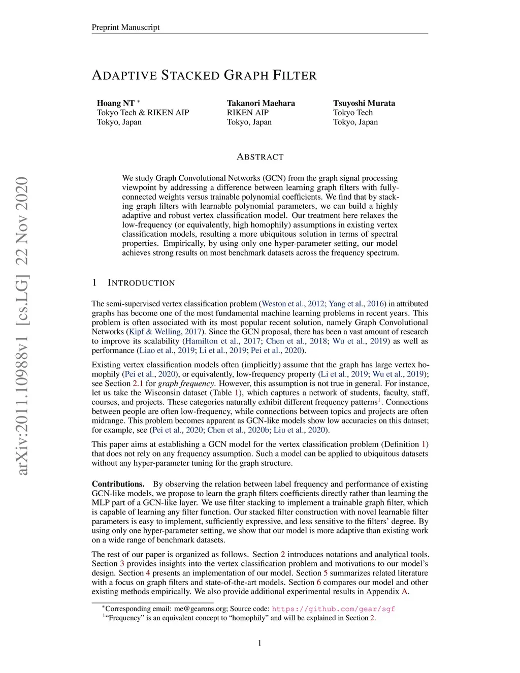 We study Graph Convolutional Networks (GCN) from the graph signal processing viewpoint by addressing a difference between learning graph filters with fully connected weights versus trainable polynomial coefficients. We find that by stacking graph filters with learnable polynomial parameters, we can build a highly adaptive and robust vertex classification model. Our treatment here relaxes the low-frequency (or equivalently, high homophily) assumptions in existing vertex classification models, resulting a more ubiquitous solution in terms of spectral properties. Empirically, by using only one hyper-parameter setting, our model achieves strong results on most benchmark datasets across the frequency spectrum.
