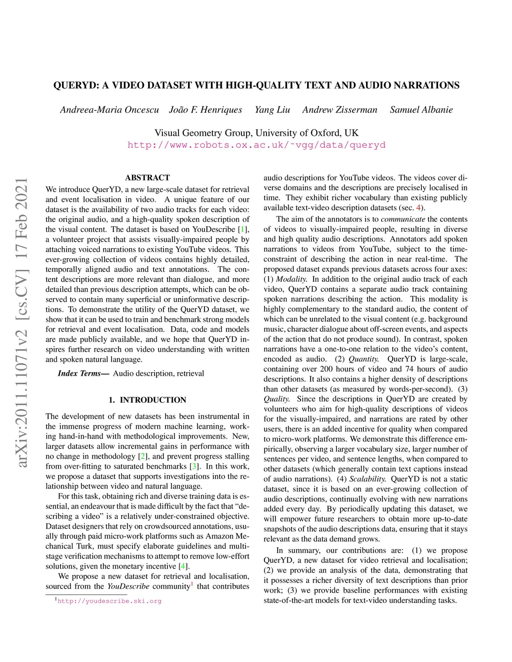 We introduce QuerYD, a new large-scale dataset for retrieval and event localisation in video. A unique feature of our dataset is the availability of two audio tracks for each video: the original audio, and a high-quality spoken description of the visual content. The dataset is based on YouDescribe, a volunteer project that assists visually-impaired people by attaching voiced narrations to existing YouTube videos. This ever-growing collection of videos contains highly detailed, temporally aligned audio and text annotations. The content descriptions are more relevant than dialogue, and more detailed than previous description attempts, which can be observed to contain many superficial or uninformative descriptions. To demonstrate the utility of the QuerYD dataset, we show that it can be used to train and benchmark strong models for retrieval and event localisation. Data, code and models are made publicly available, and we hope that QuerYD inspires further research on video understanding with written and spoken natural language.