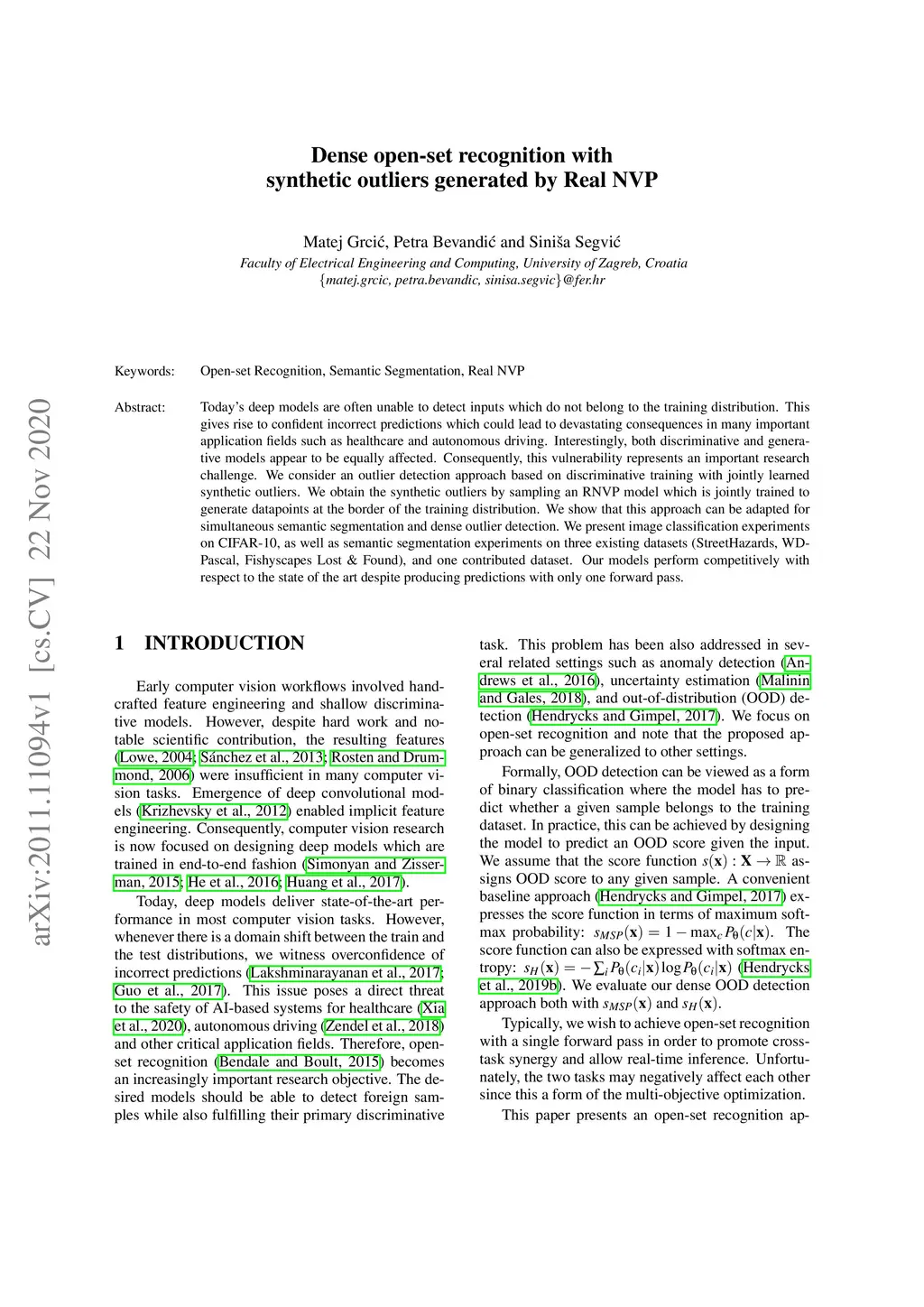 Today's deep models are often unable to detect inputs which do not belong to the training distribution. This gives rise to confident incorrect predictions which could lead to devastating consequences in many important application fields such as healthcare and autonomous driving. Interestingly, both discriminative and generative models appear to be equally affected. Consequently, this vulnerability represents an important research challenge. We consider an outlier detection approach based on discriminative training with jointly learned synthetic outliers. We obtain the synthetic outliers by sampling an RNVP model which is jointly trained to generate datapoints at the border of the training distribution. We show that this approach can be adapted for simultaneous semantic segmentation and dense outlier detection. We present image classification experiments on CIFAR-10, as well as semantic segmentation experiments on three existing datasets (StreetHazards, WD-Pascal, Fishyscapes Lost & Found), and one contributed dataset. Our models perform competitively with respect to the state of the art despite producing predictions with only one forward pass.