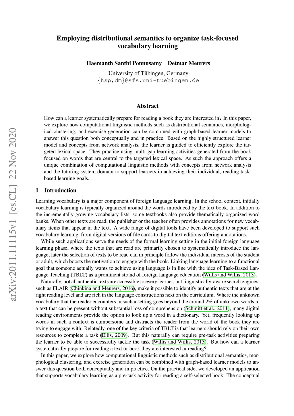 How can a learner systematically prepare for reading a book they are interested in? In this paper,we explore how computational linguistic methods such as distributional semantics, morphological clustering, and exercise generation can be combined with graph-based learner models to answer this question both conceptually and in practice. Based on the highly structured learner model and concepts from network analysis, the learner is guided to efficiently explore the targeted lexical space. They practice using multi-gap learning activities generated from the book focused on words that are central to the targeted lexical space. As such the approach offers a unique combination of computational linguistic methods with concepts from network analysis and the tutoring system domain to support learners in achieving their individual, reading task-based learning goals.