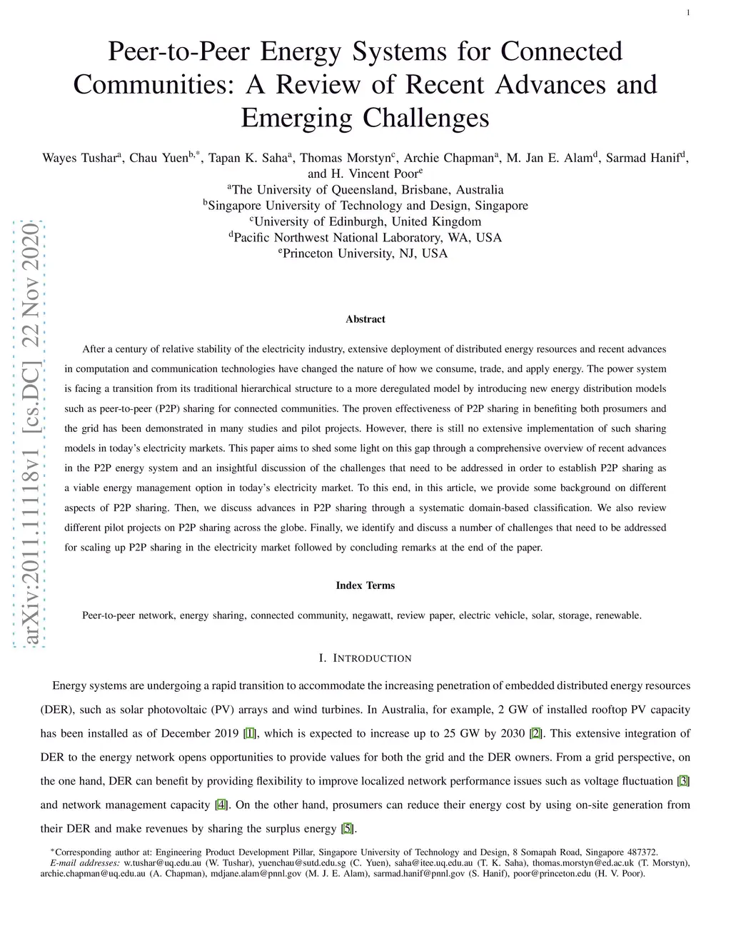 Peer-to-Peer Energy Systems for Connected Communities: A Review of