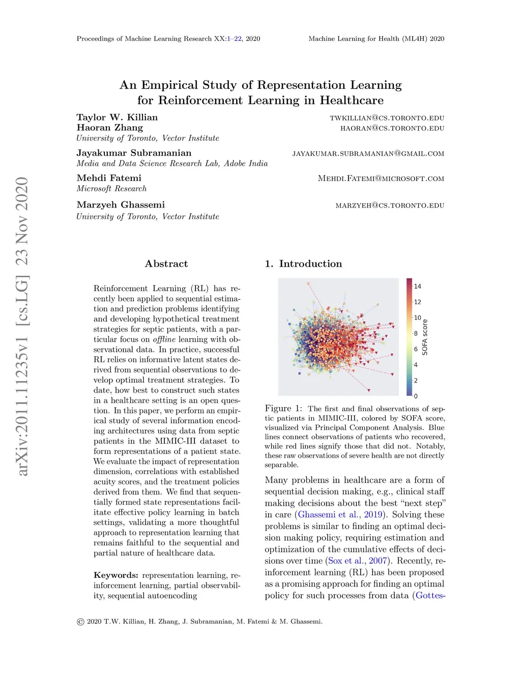 Reinforcement Learning (RL) has recently been applied to sequential estimation and prediction problems identifying and developing hypothetical treatment strategies for septic patients, with a particular focus on offline learning with observational data. In practice, successful RL relies on informative latent states derived from sequential observations to develop optimal treatment strategies. To date, how best to construct such states in a healthcare setting is an open question. In this paper, we perform an empirical study of several information encoding architectures using data from septic patients in the MIMIC-III dataset to form representations of a patient state. We evaluate the impact of representation dimension, correlations with established acuity scores, and the treatment policies derived from them. We find that sequentially formed state representations facilitate effective policy learning in batch settings, validating a more thoughtful approach to representation learning that remains faithful to the sequential and partial nature of healthcare data.
