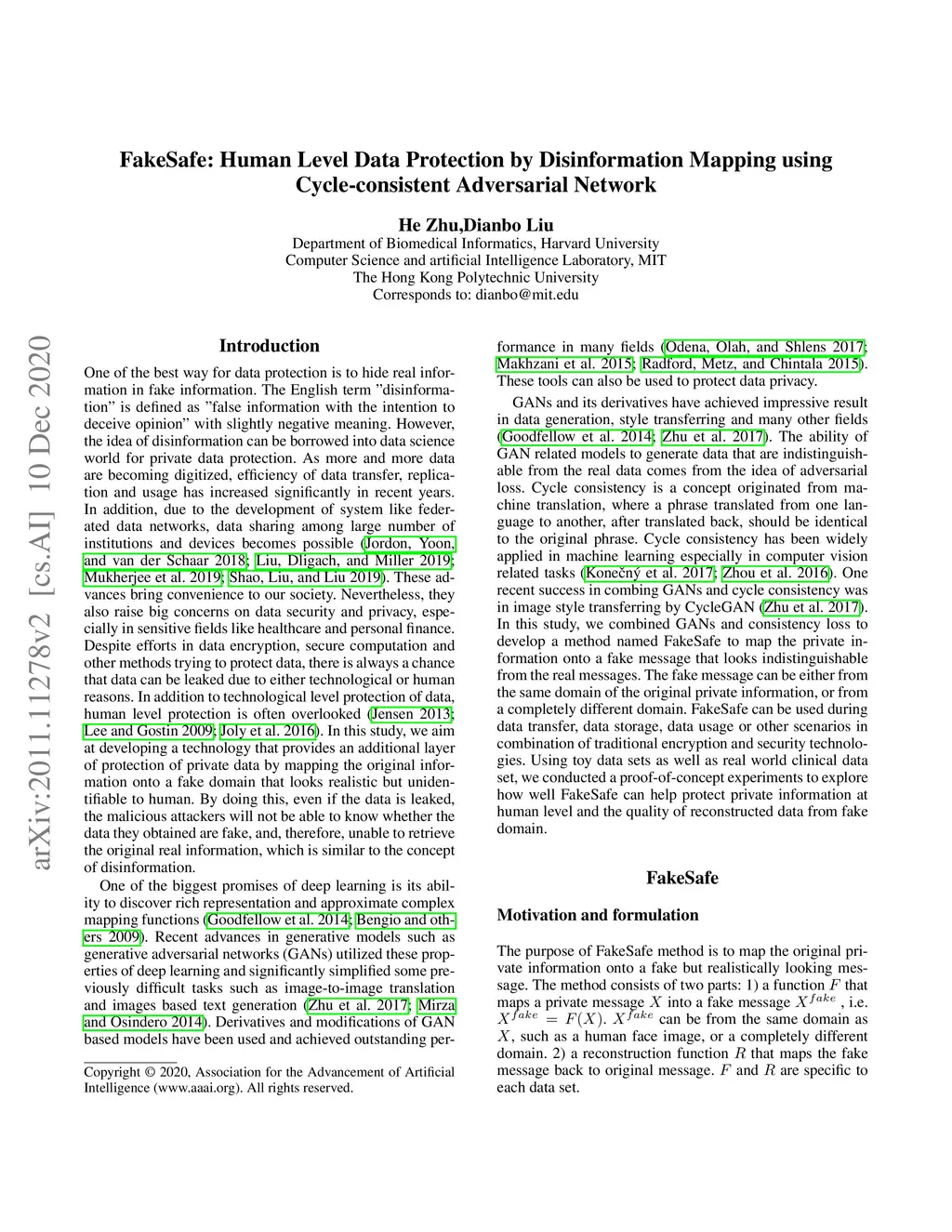 The concept of disinformation is to use fake messages to confuse people in order to protect the real information. This strategy can be adapted into data science to protect valuable private and sensitive data. Huge amount of private data are being generated from personal devices such as smart phone and wearable in recent years. Being able to utilize these personal data will bring big opportunities to design personalized products, conduct precision healthcare and many other tasks that were impossible in the past. However, due to privacy, safety and regulation reasons, it is often difficult to transfer or store data in its original form while keeping them safe. Building a secure data transfer and storage infrastructure to preserving privacy is costly in most cases and there is always a concern of data security due to human errors. In this study, we propose a method, named FakeSafe, to provide human level data protection using generative adversarial network with cycle consistency and conducted experiments using both benchmark and real world data sets to illustrate potential applications of FakeSafe.