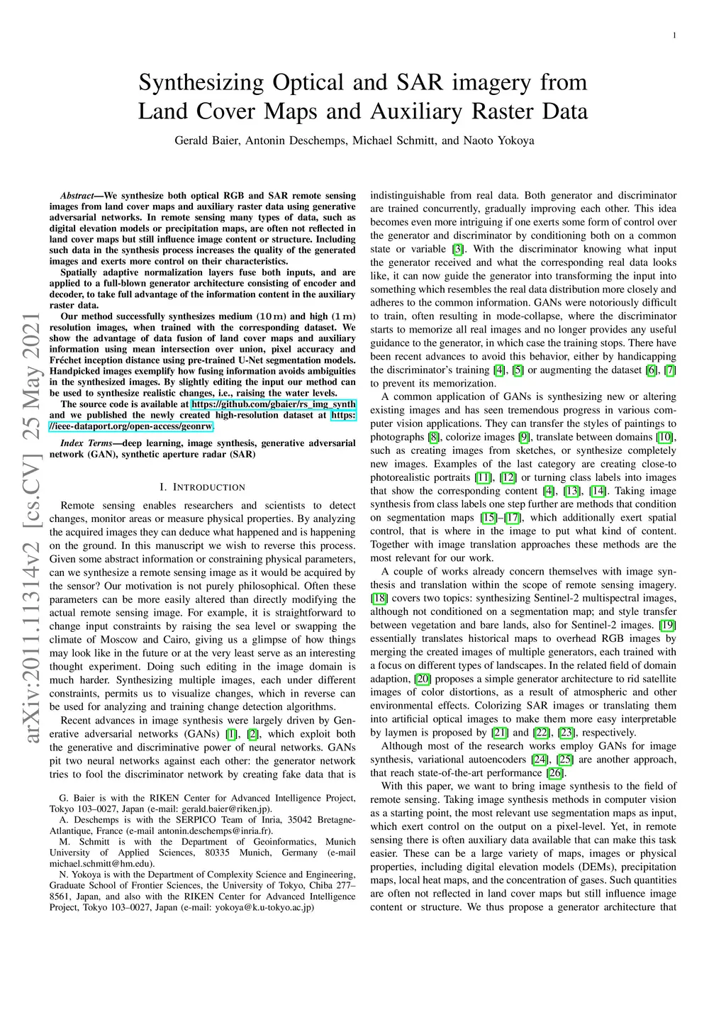 We synthesize both optical RGB and synthetic aperture radar (SAR) remote sensing images from land cover maps and auxiliary raster data using generative adversarial networks (GANs). In remote sensing, many types of data, such as digital elevation models (DEMs) or precipitation maps, are often not reflected in land cover maps but still influence image content or structure. Including such data in the synthesis process increases the quality of the generated images and exerts more control on their characteristics. Spatially adaptive normalization layers fuse both inputs and are applied to a full-blown generator architecture consisting of encoder and decoder to take full advantage of the information content in the auxiliary raster data. Our method successfully synthesizes medium (10 m) and high (1 m) resolution images when trained with the corresponding data set. We show the advantage of data fusion of land cover maps and auxiliary information using mean intersection over unions (mIoUs), pixel accuracy, and Fr\échet inception distances (FIDs) using pretrained U-Net segmentation models. Handpicked images exemplify how fusing information avoids ambiguities in the synthesized images. By slightly editing the input, our method can be used to synthesize realistic changes, i.e., raising the water levels. The source code is available at https://github.com/gbaier/rs_img_synth and we published the newly created high-resolution dataset at https://ieee-dataport.org/open-access/geonrw.