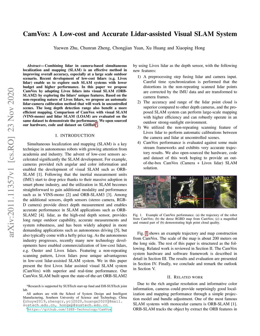 Combining lidar in camera-based simultaneous localization and mapping (SLAM) is an effective method in improving overall accuracy, especially at a large scale outdoor scenario. Recent development of low-cost lidars (e.g. Livox lidar) enable us to explore such SLAM systems with lower budget and higher performance. In this paper we propose CamVox by adapting Livox lidars into visual SLAM (ORB-SLAM2) by exploring the lidars' unique features. Based on the non-repeating nature of Livox lidars, we propose an automatic lidar-camera calibration method that will work in uncontrolled scenes. The long depth detection range also benefit a more efficient mapping. Comparison of CamVox with visual SLAM (VINS-mono) and lidar SLAM (LOAM) are evaluated on the same dataset to demonstrate the performance. We open sourced our hardware, code and dataset on GitHub.