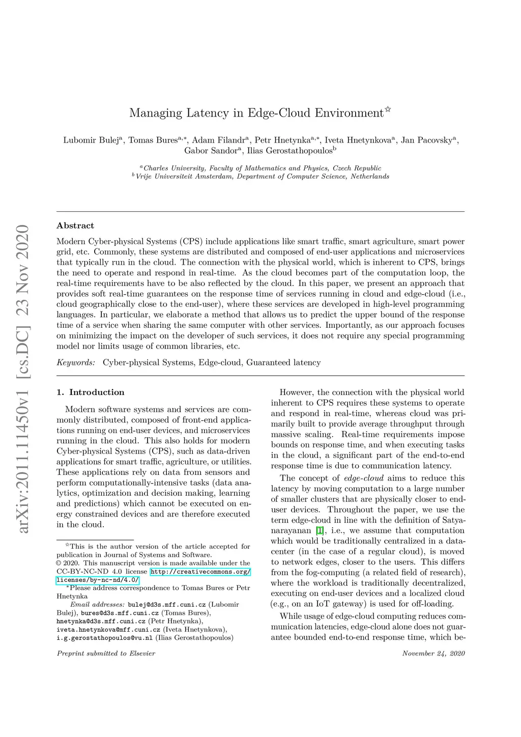 Modern Cyber-physical Systems (CPS) include applications like smart traffic, smart agriculture, smart power grid, etc. Commonly, these systems are distributed and composed of end-user applications and microservices that typically run in the cloud. The connection with the physical world, which is inherent to CPS, brings the need to operate and respond in real-time. As the cloud becomes part of the computation loop, the real-time requirements have to be also reflected by the cloud. In this paper, we present an approach that provides soft real-time guarantees on the response time of services running in cloud and edge-cloud (i.e., cloud geographically close to the end-user), where these services are developed in high-level programming languages. In particular, we elaborate a method that allows us to predict the upper bound of the response time of a service when sharing the same computer with other services. Importantly, as our approach focuses on minimizing the impact on the developer of such services, it does not require any special programming model nor limits usage of common libraries, etc.