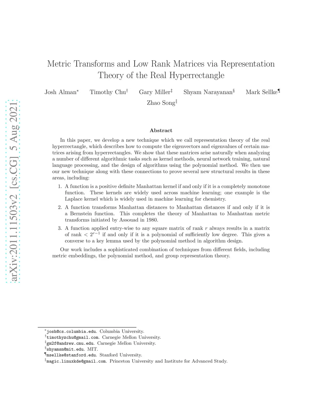 In this paper, we develop a new technique which we call representation theory of the real hyperrectangle, which describes how to compute the eigenvectors and eigenvalues of certain matrices arising from hyperrectangles. We show that these matrices arise naturally when analyzing a number of different algorithmic tasks such as kernel methods, neural network training, natural language processing, and the design of algorithms using the polynomial method. We then use our new technique along with these connections to prove several new structural results in these areas, including: A function is a positive definite Manhattan kernel if and only if it is a completely monotone function. These kernels are widely used across machine learning; one example is the Laplace kernel which is widely used in machine learning for chemistry. A function transforms Manhattan distances to Manhattan distances if and only if it is a Bernstein function. This completes the theory of Manhattan to Manhattan metric transforms initiated by Assouad in 1980. A function applied entry-wise to any square matrix of rank always results in a matrix of rank if and only if it is a polynomial of sufficiently low degree. This gives a converse to a key lemma used by the polynomial method in algorithm design. Our work includes a sophisticated combination of techniques from different fields, including metric embeddings, the polynomial method, and group representation theory.