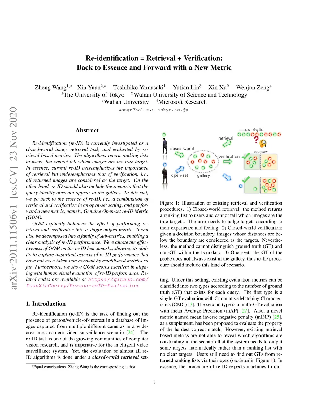 Re-identification (re-ID) is currently investigated as a closed-world image retrieval task, and evaluated by retrieval based metrics. The algorithms return ranking lists to users, but cannot tell which images are the true target. In essence, current re-ID overemphasizes the importance of retrieval but underemphasizes that of verification, \textit{i.e.}, all returned images are considered as the target. On the other hand, re-ID should also include the scenario that the query identity does not appear in the gallery. To this end, we go back to the essence of re-ID, \textit{i.e.}, a combination of retrieval and verification in an open-set setting, and put forward a new metric, namely, Genuine Open-set re-ID Metric (GOM). GOM explicitly balances the effect of performing retrieval and verification into a single unified metric. It can also be decomposed into a family of sub-metrics, enabling a clear analysis of re-ID performance. We evaluate the effectiveness of GOM on the re-ID benchmarks, showing its ability to capture important aspects of re-ID performance that have not been taken into account by established metrics so far. Furthermore, we show GOM scores excellent in aligning with human visual evaluation of re-ID performance. Related codes are available at https://github.com/YuanXinCherry/Person-reID-Evaluation