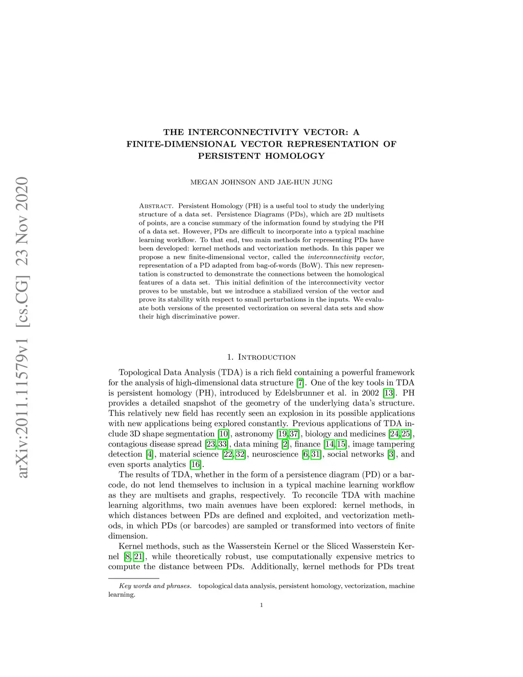 Persistent Homology (PH) is a useful tool to study the underlying structure of a data set. Persistence Diagrams (PDs), which are 2D multisets of points, are a concise summary of the information found by studying the PH of a data set. However, PDs are difficult to incorporate into a typical machine learning workflow. To that end, two main methods for representing PDs have been developed: kernel methods and vectorization methods. In this paper we propose a new finite-dimensional vector, called the interconnectivity vector, representation of a PD adapted from Bag-of-Words (BoW). This new representation is constructed to demonstrate the connections between the homological features of a data set. This initial definition of the interconnectivity vector proves to be unstable, but we introduce a stabilized version of the vector and prove its stability with respect to small perturbations in the inputs. We evaluate both versions of the presented vectorization on several data sets and show their high discriminative power.