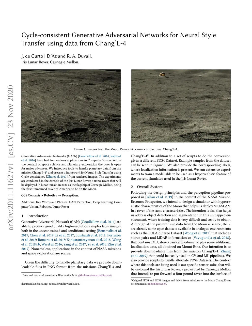 Generative Adversarial Networks (GANs) have had tremendous applications in Computer Vision. Yet, in the context of space science and planetary exploration the door is open for major advances. We introduce tools to handle planetary data from the mission ChangÉ-4 and present a framework for Neural Style Transfer using Cycle-consistency from rendered images. The experiments are conducted in the context of the Iris Lunar Rover, a nano-rover that will be deployed in lunar terrain in 2021 as the flagship of Carnegie Mellon, being the first unmanned rover of America to be on the Moon.