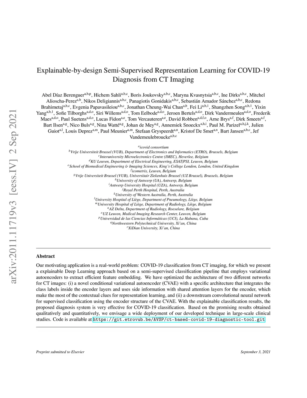 Our motivating application is a real-world problem: COVID-19 classification from CT imaging, for which we present an explainable Deep Learning approach based on a semi-supervised classification pipeline that employs variational autoencoders to extract efficient feature embedding. We have optimized the architecture of two different networks for CT images: (i) a novel conditional variational autoencoder (CVAE) with a specific architecture that integrates the class labels inside the encoder layers and uses side information with shared attention layers for the encoder, which make the most of the contextual clues for representation learning, and (ii) a downstream convolutional neural network for supervised classification using the encoder structure of the CVAE. With the explainable classification results, the proposed diagnosis system is very effective for COVID-19 classification. Based on the promising results obtained qualitatively and quantitatively, we envisage a wide deployment of our developed technique in large-scale clinical studies.Code is available at https://git.etrovub.be/AVSP/ct-based-covid-19-diagnostic-tool.git.