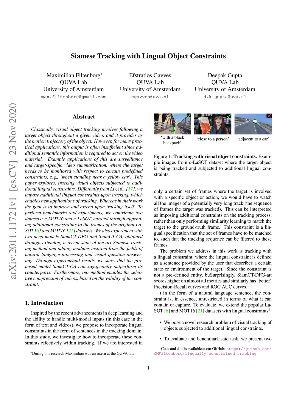 Classically, visual object tracking involves following a target object throughout a given video, and it provides us the motion trajectory of the object. However, for many practical applications, this output is often insufficient since additional semantic information is required to act on the video material. Example applications of this are surveillance and target-specific video summarization, where the target needs to be monitored with respect to certain predefined constraints, e.g., 'when standing near a yellow car'. This paper explores, tracking visual objects subjected to additional lingual constraints. Differently from Li et al., we impose additional lingual constraints upon tracking, which enables new applications of tracking. Whereas in their work the goal is to improve and extend upon tracking itself. To perform benchmarks and experiments, we contribute two datasets: c-MOT16 and c-LaSOT, curated through appending additional constraints to the frames of the original LaSOT and MOT16 datasets. We also experiment with two deep models SiamCT-DFG and SiamCT-CA, obtained through extending a recent state-of-the-art Siamese tracking method and adding modules inspired from the fields of natural language processing and visual question answering. Through experimental results, we show that the proposed model SiamCT-CA can significantly outperform its counterparts. Furthermore, our method enables the selective compression of videos, based on the validity of the constraint.