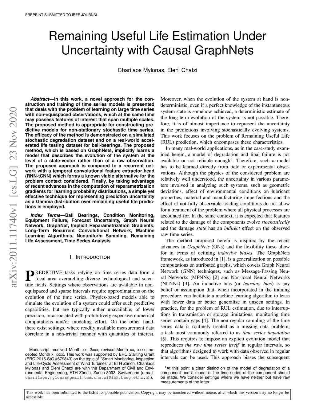 In this work, a novel approach for the construction and training of time series models is presented that deals with the problem of learning on large time series with non-equispaced observations, which at the same time may possess features of interest that span multiple scales. The proposed method is appropriate for constructing predictive models for non-stationary stochastic time series.The efficacy of the method is demonstrated on a simulated stochastic degradation dataset and on a real-world accelerated life testing dataset for ball-bearings. The proposed method, which is based on GraphNets, implicitly learns a model that describes the evolution of the system at the level of a state-vector rather than of a raw observation. The proposed approach is compared to a recurrent network with a temporal convolutional feature extractor head (RNN-tCNN) which forms a known viable alternative for the problem context considered. Finally, by taking advantage of recent advances in the computation of reparametrization gradients for learning probability distributions, a simple yet effective technique for representing prediction uncertainty as a Gamma distribution over remaining useful life predictions is employed.