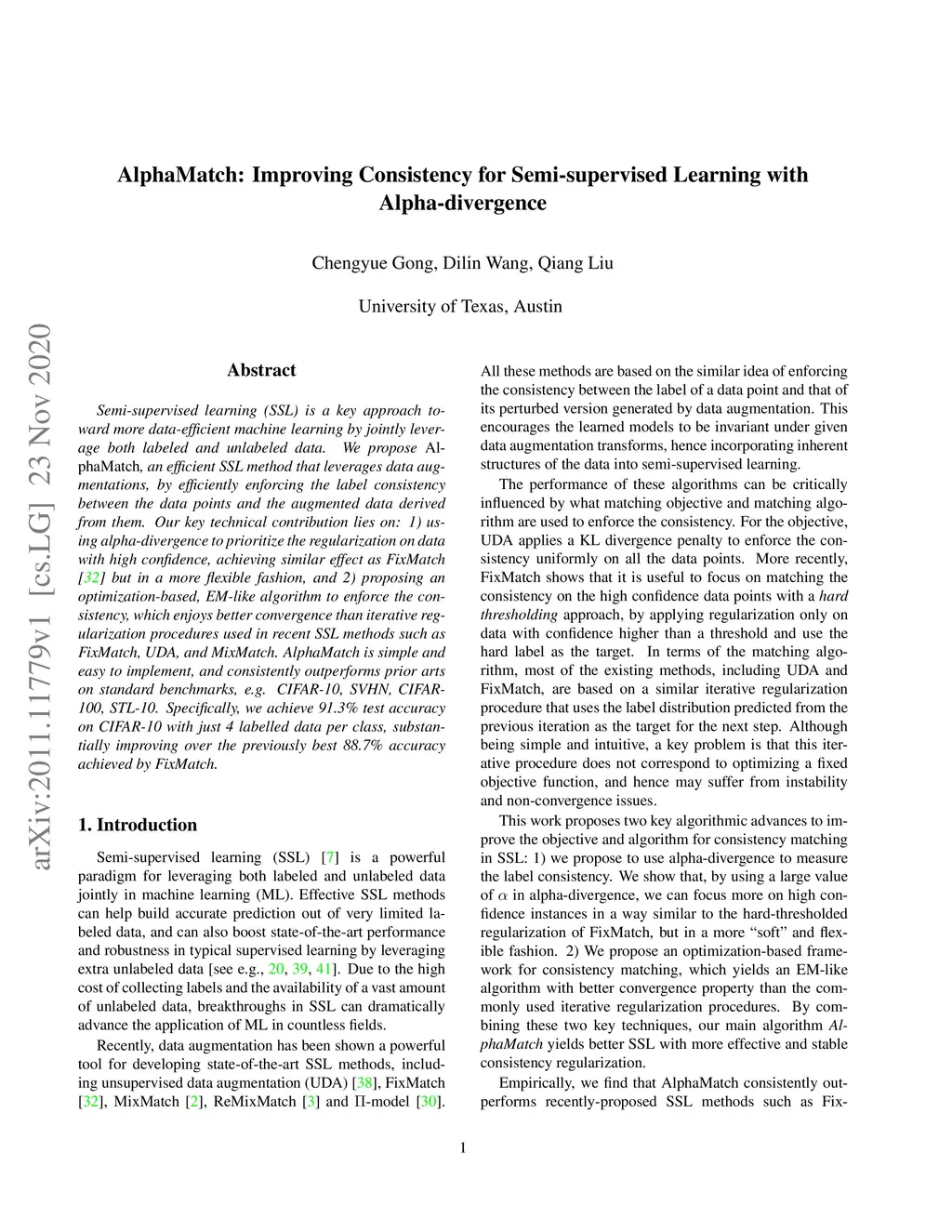 Semi-supervised learning (SSL) is a key approach toward more data-efficient machine learning by jointly leverage both labeled and unlabeled data. We propose AlphaMatch, an efficient SSL method that leverages data augmentations, by efficiently enforcing the label consistency between the data points and the augmented data derived from them. Our key technical contribution lies on: 1) using alpha-divergence to prioritize the regularization on data with high confidence, achieving a similar effect as FixMatch but in a more flexible fashion, and 2) proposing an optimization-based, EM-like algorithm to enforce the consistency, which enjoys better convergence than iterative regularization procedures used in recent SSL methods such as FixMatch, UDA, and MixMatch. AlphaMatch is simple and easy to implement, and consistently outperforms prior arts on standard benchmarks, e.g. CIFAR-10, SVHN, CIFAR-100, STL-10. Specifically, we achieve 91.3% test accuracy on CIFAR-10 with just 4 labelled data per class, substantially improving over the previously best 88.7% accuracy achieved by FixMatch.