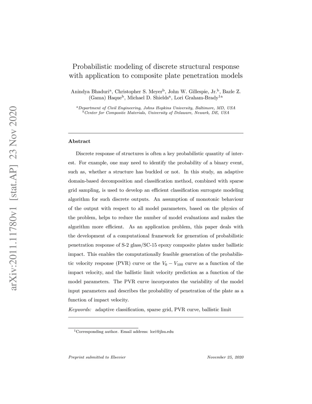 Discrete response of structures is often a key probabilistic quantity of interest. For example, one may need to identify the probability of a binary event, such as, whether a structure has buckled or not. In this study, an adaptive domain-based decomposition and classification method, combined with sparse grid sampling, is used to develop an efficient classification surrogate modeling algorithm for such discrete outputs. An assumption of monotonic behaviour of the output with respect to all model parameters, based on the physics of the problem, helps to reduce the number of model evaluations and makes the algorithm more efficient. As an application problem, this paper deals with the development of a computational framework for generation of probabilistic penetration response of S-2 glass/SC-15 epoxy composite plates under ballistic impact. This enables the computationally feasible generation of the probabilistic velocity response (PVR) curve or the curve as a function of the impact velocity, and the ballistic limit velocity prediction as a function of the model parameters. The PVR curve incorporates the variability of the model input parameters and describes the probability of penetration of the plate as a function of impact velocity.