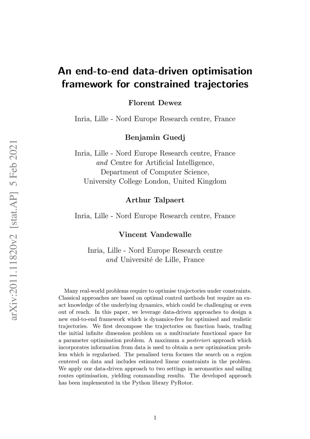 Many real-world problems require to optimise trajectories under constraints. Classical approaches are based on optimal control methods but require an exact knowledge of the underlying dynamics, which could be challenging or even out of reach. In this paper, we leverage data-driven approaches to design a new end-to-end framework which is dynamics-free for optimised and realistic trajectories. We first decompose the trajectories on function basis, trading the initial infinite dimension problem on a multivariate functional space for a parameter optimisation problem. A maximum \emph{a posteriori} approach which incorporates information from data is used to obtain a new optimisation problem which is regularised. The penalised term focuses the search on a region centered on data and includes estimated linear constraints in the problem. We apply our data-driven approach to two settings in aeronautics and sailing routes optimisation, yielding commanding results. The developed approach has been implemented in the Python library PyRotor.