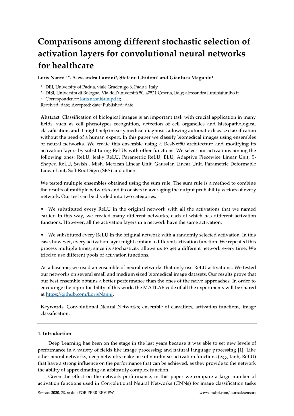 Classification of biological images is an important task with crucial application in many fields, such as cell phenotypes recognition, detection of cell organelles and histopathological classification, and it might help in early medical diagnosis, allowing automatic disease classification without the need of a human expert. In this paper we classify biomedical images using ensembles of neural networks. We create this ensemble using a ResNet50 architecture and modifying its activation layers by substituting ReLUs with other functions. We select our activations among the following ones: ReLU, leaky ReLU, Parametric ReLU, ELU, Adaptive Piecewice Linear Unit, S-Shaped ReLU, Swish , Mish, Mexican Linear Unit, Gaussian Linear Unit, Parametric Deformable Linear Unit, Soft Root Sign (SRS) and others. As a baseline, we used an ensemble of neural networks that only use ReLU activations. We tested our networks on several small and medium sized biomedical image datasets. Our results prove that our best ensemble obtains a better performance than the ones of the naive approaches. In order to encourage the reproducibility of this work, the MATLAB code of all the experiments will be shared at https://github.com/LorisNanni.