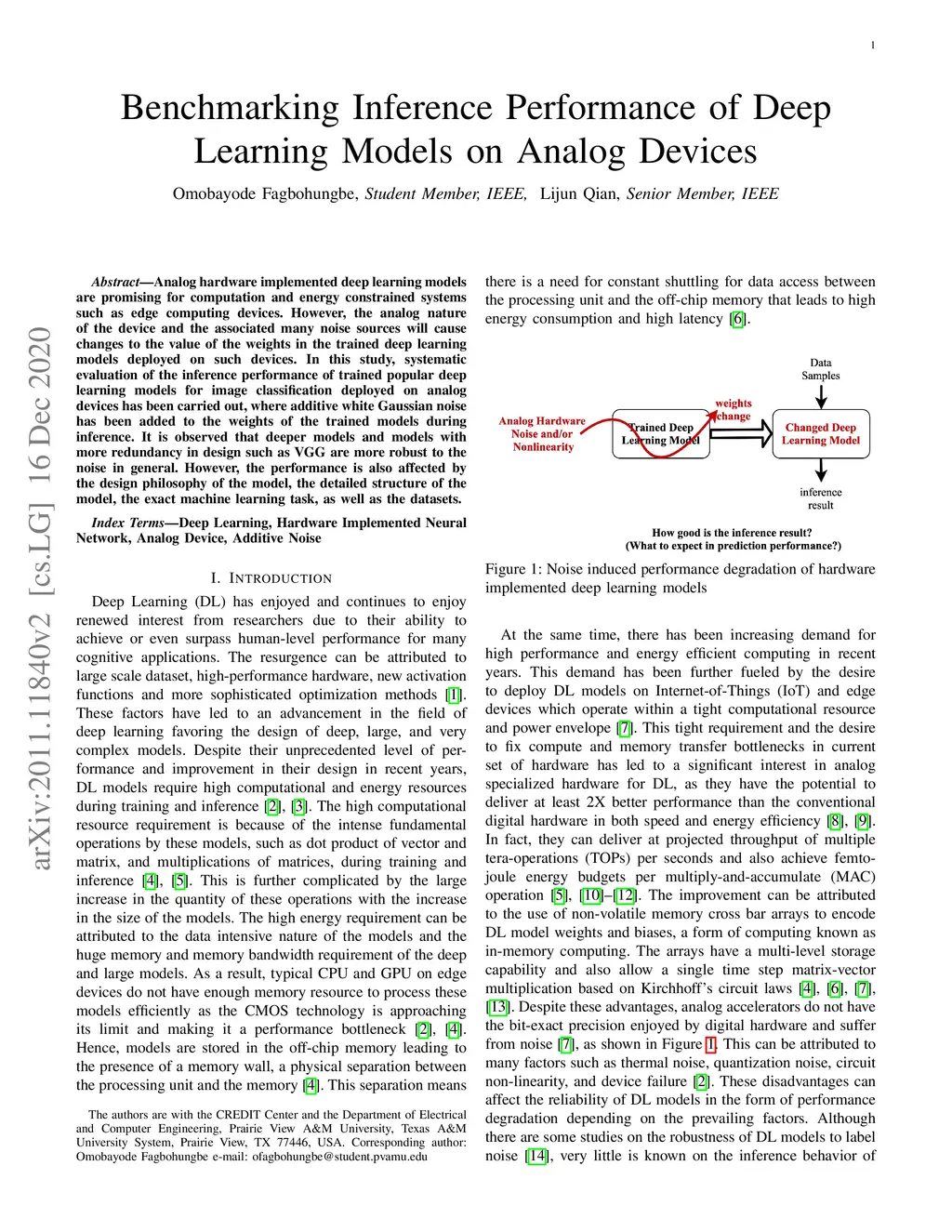 Analog hardware implemented deep learning models are promising for computation and energy constrained systems such as edge computing devices. However, the analog nature of the device and the associated many noise sources will cause changes to the value of the weights in the trained deep learning models deployed on such devices. In this study, systematic evaluation of the inference performance of trained popular deep learning models for image classification deployed on analog devices has been carried out, where additive white Gaussian noise has been added to the weights of the trained models during inference. It is observed that deeper models and models with more redundancy in design such as VGG are more robust to the noise in general. However, the performance is also affected by the design philosophy of the model, the detailed structure of the model, the exact machine learning task, as well as the datasets.