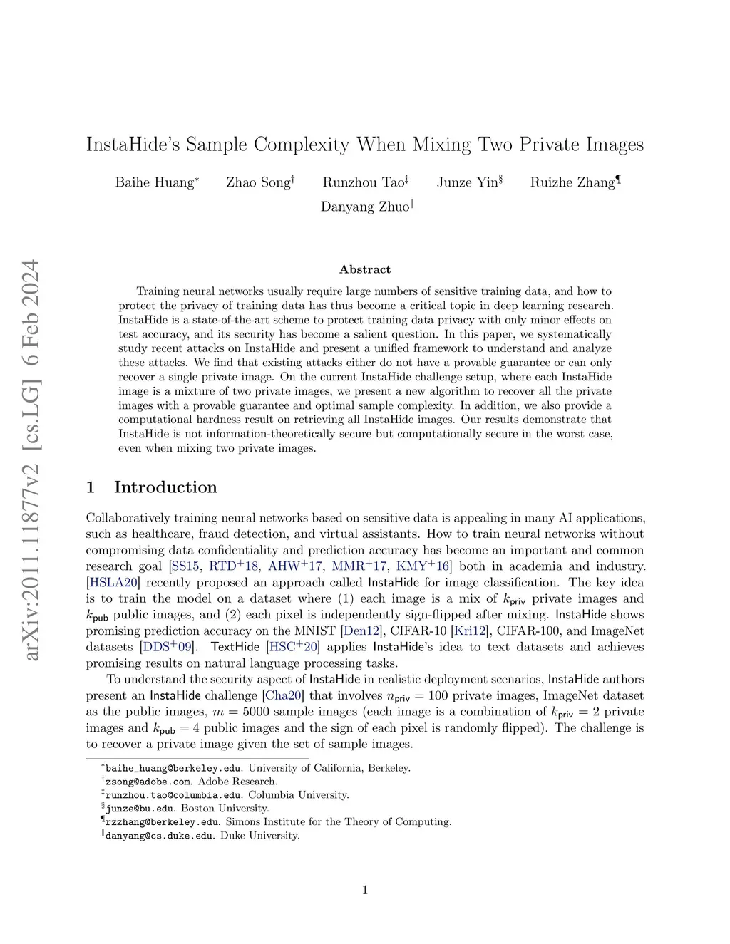Training neural networks usually require large numbers of sensitive training data, and how to protect the privacy of training data has thus become a critical topic in deep learning research. InstaHide is a state-of-the-art scheme to protect training data privacy with only minor effects on test accuracy, and its security has become a salient question. In this paper, we systematically study recent attacks on InstaHide and present a unified framework to understand and analyze these attacks. We find that existing attacks either do not have a provable guarantee or can only recover a single private image. On the current InstaHide challenge setup, where each InstaHide image is a mixture of two private images, we present a new algorithm to recover all the private images with a provable guarantee and optimal sample complexity. In addition, we also provide a computational hardness result on retrieving all InstaHide images. Our results demonstrate that InstaHide is not information-theoretically secure but computationally secure in the worst case, even when mixing two private images.