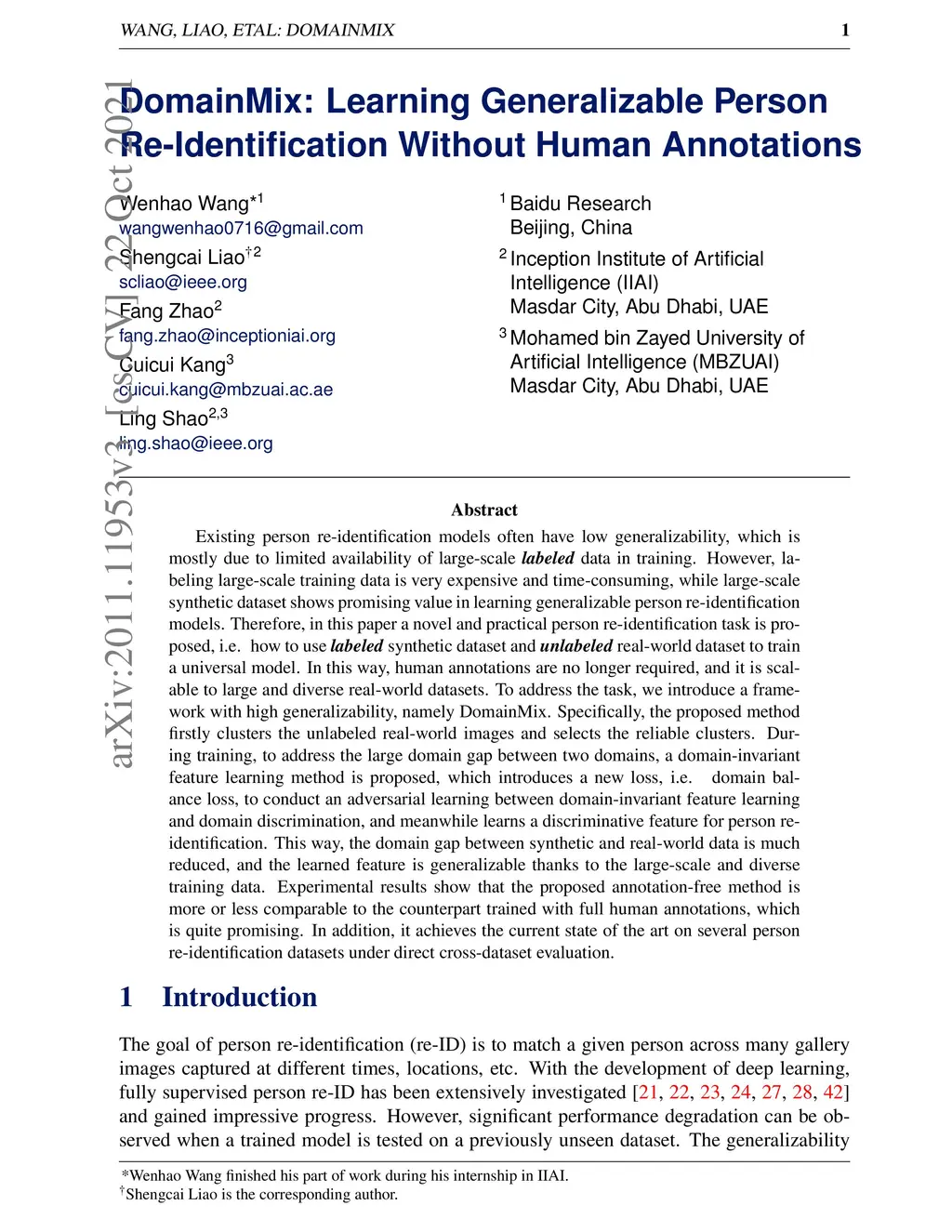 Existing person re-identification models often have low generalizability, which is mostly due to limited availability of large-scale labeled data in training. However, labeling large-scale training data is very expensive and time-consuming, while large-scale synthetic dataset shows promising value in learning generalizable person re-identification models. Therefore, in this paper a novel and practical person re-identification task is proposed,i.e. how to use labeled synthetic dataset and unlabeled real-world dataset to train a universal model. In this way, human annotations are no longer required, and it is scalable to large and diverse real-world datasets. To address the task, we introduce a framework with high generalizability, namely DomainMix. Specifically, the proposed method firstly clusters the unlabeled real-world images and selects the reliable clusters. During training, to address the large domain gap between two domains, a domain-invariant feature learning method is proposed, which introduces a new loss,i.e. domain balance loss, to conduct an adversarial learning between domain-invariant feature learning and domain discrimination, and meanwhile learns a discriminative feature for person re-identification. This way, the domain gap between synthetic and real-world data is much reduced, and the learned feature is generalizable thanks to the large-scale and diverse training data. Experimental results show that the proposed annotation-free method is more or less comparable to the counterpart trained with full human annotations, which is quite promising. In addition, it achieves the current state of the art on several person re-identification datasets under direct cross-dataset evaluation.